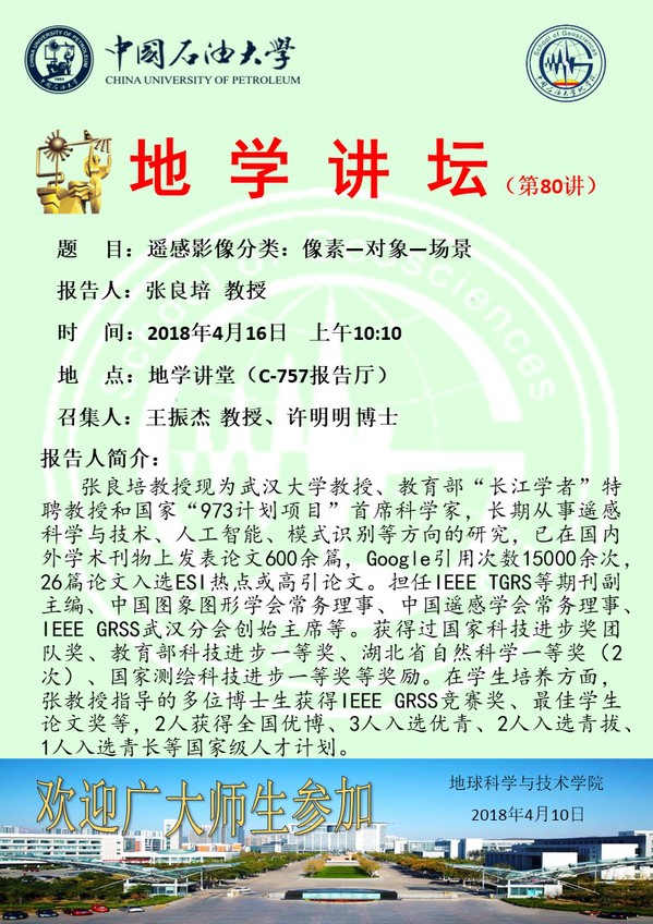 【地学讲坛第80讲】关于张良培教授学术报告的通知