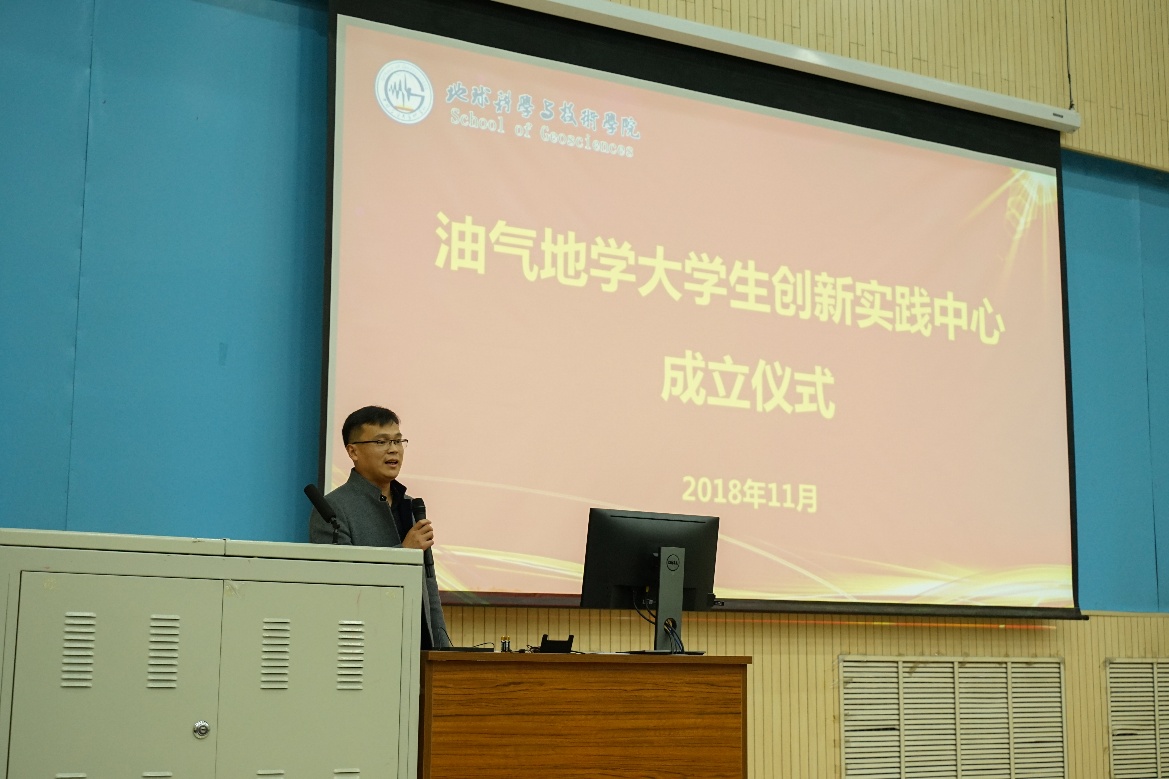 11月24日下午,油气地学老员工创新实践中心成立仪式在南教楼100号举行,教务处副处长刘臻、公司党委书记张卫东、副经理吴智平、院属各单位主要负责人和6位学科竞赛指导老师出席仪式,公司党委副书记徐永涛主持仪式。