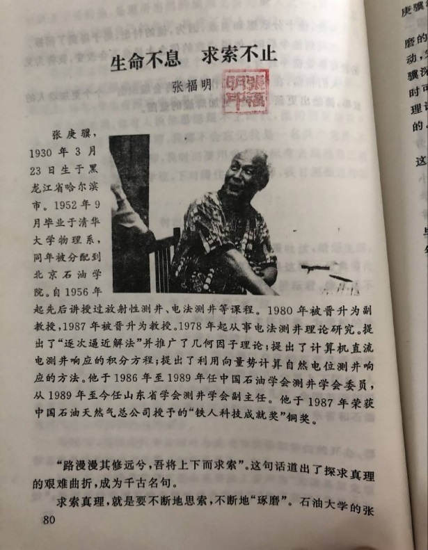 1998年,学校组织编篡并出版了专门介绍老教师的《红烛融融》一书(石油大学出版社,1998年),其中一篇是专门介绍张庚骥老师的(图三),本人当时被安排采写本文。成文后,商讨文章题目时,张老师借用屈原的“路满面其修远兮,吾将上下而求索”,建议题目取为“生命不息求索不止”。这很好的体现了他“爱琢磨”的习惯和在逆境中对知识追求永不言弃的精神。