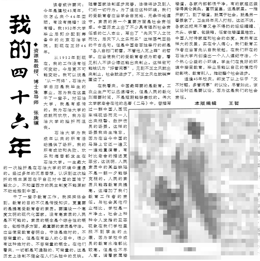 1998年10月,学校四十五周年校庆,石油大学报刊载了张庚骥老师的文章《我的四十六年》(文中自我说明,1952年清华大学毕业后即分配到筹备中的北京石油学院)。文中处处体现了一个老教育工作者对教育的思考:“在我看来,中国最需要的是教育。工业农业生产可以迅速增长,但是人民的教化则需要时间……人民的素质只能靠教育来提高,这增加了我们教育工作者的责任”,“干了一辈子教育工作,我深深体会到,教育的目的不仅是传授知识,更重要的是提高受教育者的素质”(图二)。