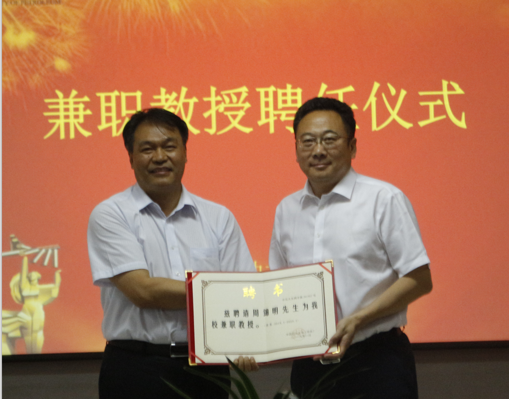 【本站讯】7月8日,公司在工科楼C757报告厅举行郭焦锋、周锦明员工兼职教授聘任仪式。副董事长操应长、伟德国际1946官网经理林承焰、经济管理学院经理周鹏等出席了聘任仪式。