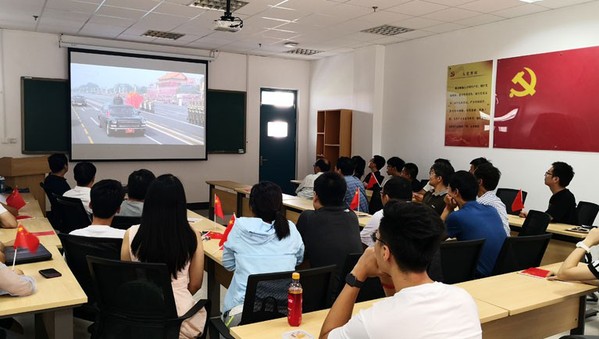 伴随国庆活动开始的号令,升国旗,奏国歌,现场的各位党员自觉起立,跟随音乐声唱起国歌,奔放有利的国歌声在室内回响;在阅兵环节,在场的各位师生党员目不转睛地盯着屏幕,跟随着习近平主席的检阅车欣赏着每一个威武雄壮的受检方队,不漏过任何一个精彩的瞬间;分列式开始,从仪仗方队,领导指挥方队,到陆海空和火箭军方队,以及战略支援、联勤保障、武警、女兵、院校科研、文职人员、预备役、民兵、维和等方队,全都迈着整齐划一、铿锵有力的正步走过天安门城楼,向全国人民展现中国人民解放军豪迈的气魄,在随后的装备方队阶段,地面突击、防空反导、海上攻防、战略打击、信息支援、后勤保障等装备的出现,一次次展现了解放军走向现代化和信息化的成果,特别是各型导弹方队和歼20飞机方队,更是将在场及全国人民的自豪感推向高潮。