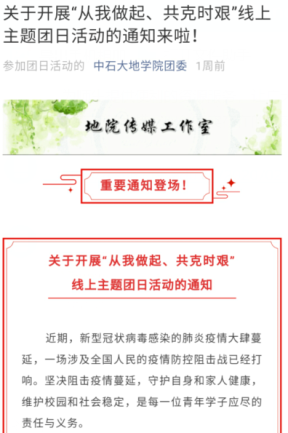 与此同时学院微信公众号定期推送推荐学习资源,各团支部通过建立学习打卡群,挑战21天等方式,鼓励同学们以各种形式丰富假期生活,保持学习和运动的良好习惯,以积极的面貌应对疫情挑战。