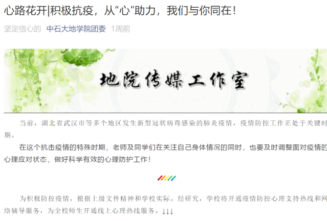 村口防疫站、社区青年先锋队…全国各地的疫情前线,也有伟德国际1946官网勘探尖兵的“逆行”身影。学院团委通过“同心抗疫·我们在行动”专栏积极宣传先进典型,激励伟德国际1946官网学子勇敢地面对疫情,投入到抗击疫情的斗争中来。