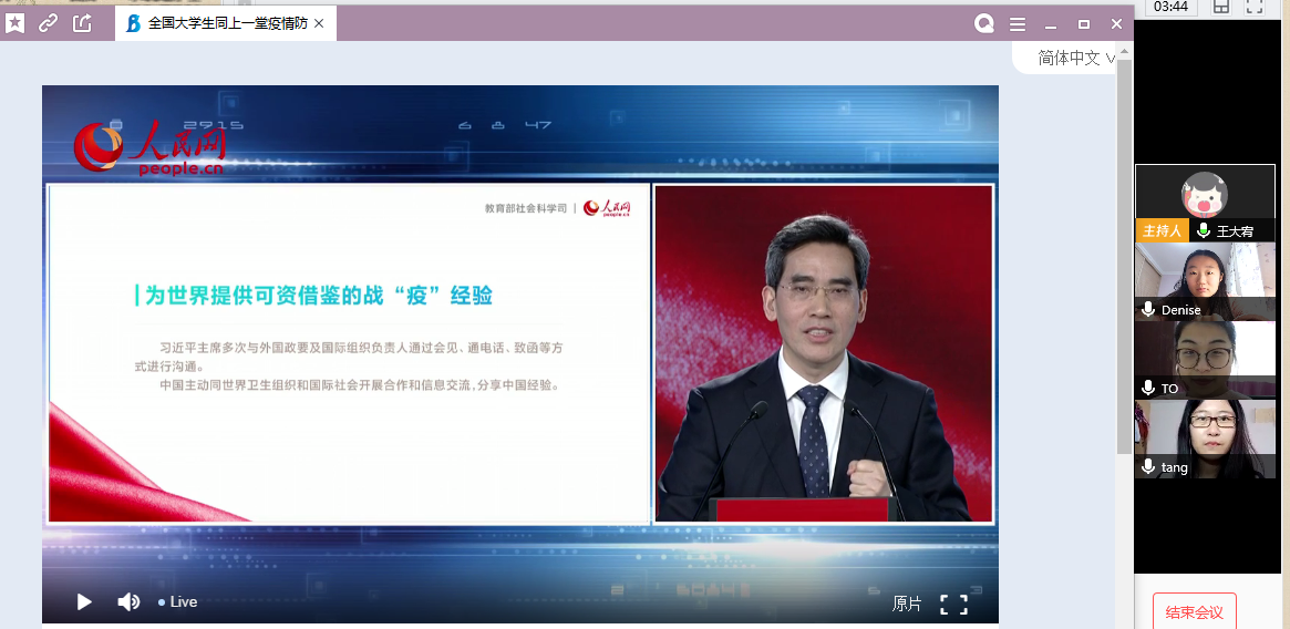 3月9日下午,由教育部社会科学司与人民网联合组织的“全国老员工同上一堂疫情防控思政大课”在人民日报社人民网“云开讲”。伟德国际1946官网积极响应,提前一天通过QQ群、微信群、微信公众号等多种渠道进行宣传,确保通知到位。在学院各党支部、团支部广泛组织员工观看直播,开展线上讨论,强化对思政课的理解和认识,提高员工党员担当责任意识,发挥党支部的战斗堡垒作用。
