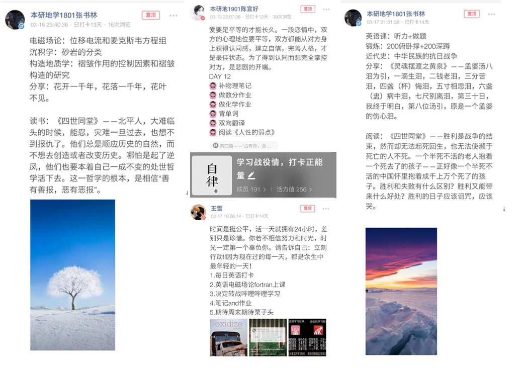 如何克服线上学习容易出现的态度懒散、效率低下等现象一直是伟德国际1946官网心理工作站在开展活动时思考解决的问题。心理健康工作站以学院员工的心理安全健康与学习效率为首要前提条件,积极响应病毒防治政策,推出“学习战疫情,打卡正能量”为期14天的学习打卡活动。参与者除学习状态和读书笔记的打卡外,还通过每日运动、电影观赏、佳肴制作等形式分享居家隔离的丰富生活。“尽管是在防疫这个非常时期,但是同学们还是能够在家隔离的同时坚持学习,闲暇之余还能找到各种方式放松,这不仅反映了同学们在家良好的学习状态,更是体现了同学们乐观向上和自律自强的精神!”活动发起者高艺谈道。