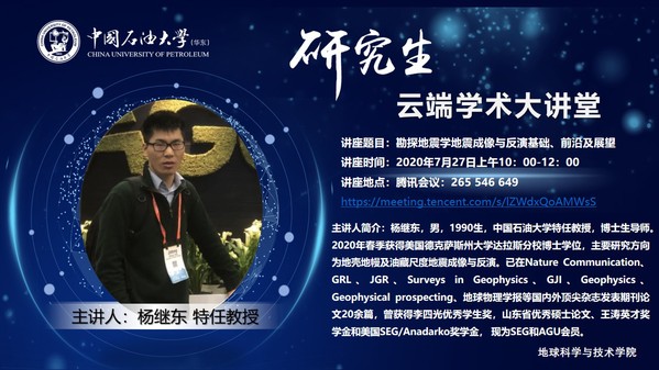 主讲人简介:杨继东,男,1990生,中国石油大学特任教授,博士生导师。2020年春季获得美国德克萨斯州大学达拉斯分校博士学位,主要研究方向为地壳地幔及油藏尺度地震成像与反演。已在Nature Communication、GRL、JGR、Surveys in Geophysics、GJI、Geophysics、Geophysical prospecting、地球物理学报等国内外顶尖杂志发表期刊论文20余篇,曾获得李四光优秀员工奖,山东省优秀硕士论文、王涛英才奖学金和美国SEG/Anadarko奖学金,现为SEG和AGU会员。