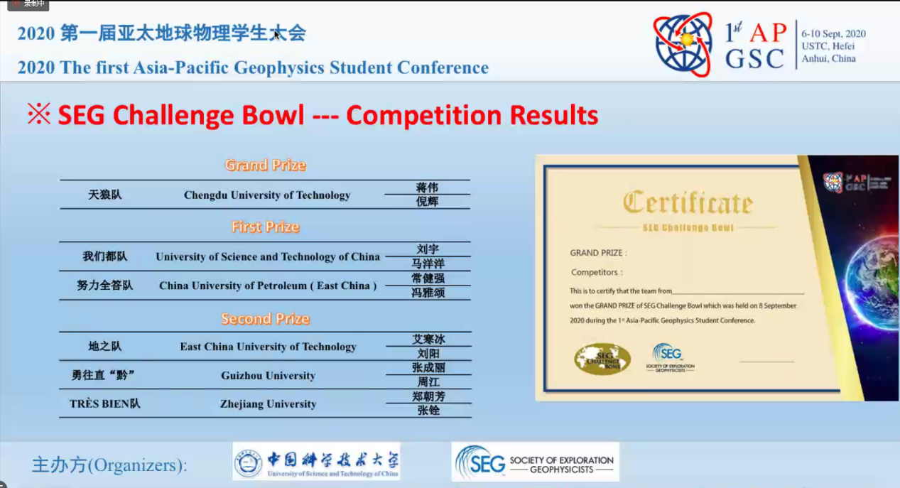 9月8日-9日,中国科学技术大学在线上举办第一届亚太地球物理员工大会暨SEG Challenge Bowl知识竞赛中国赛区决赛,来自伟德BEVlCTOR1946、中国科学技术大学、浙江大学、中国地质大学(武汉)等13所高校的代表队参加决赛。经过激烈角逐,公司地质资源与地质工程2019级研究生常健强、冯雅颂组成的“努力全答队”获得第二名的好成绩,荣获一等奖,曹丹平老师获评优秀指导教师,伟德BEVlCTOR1946获优秀组织奖。