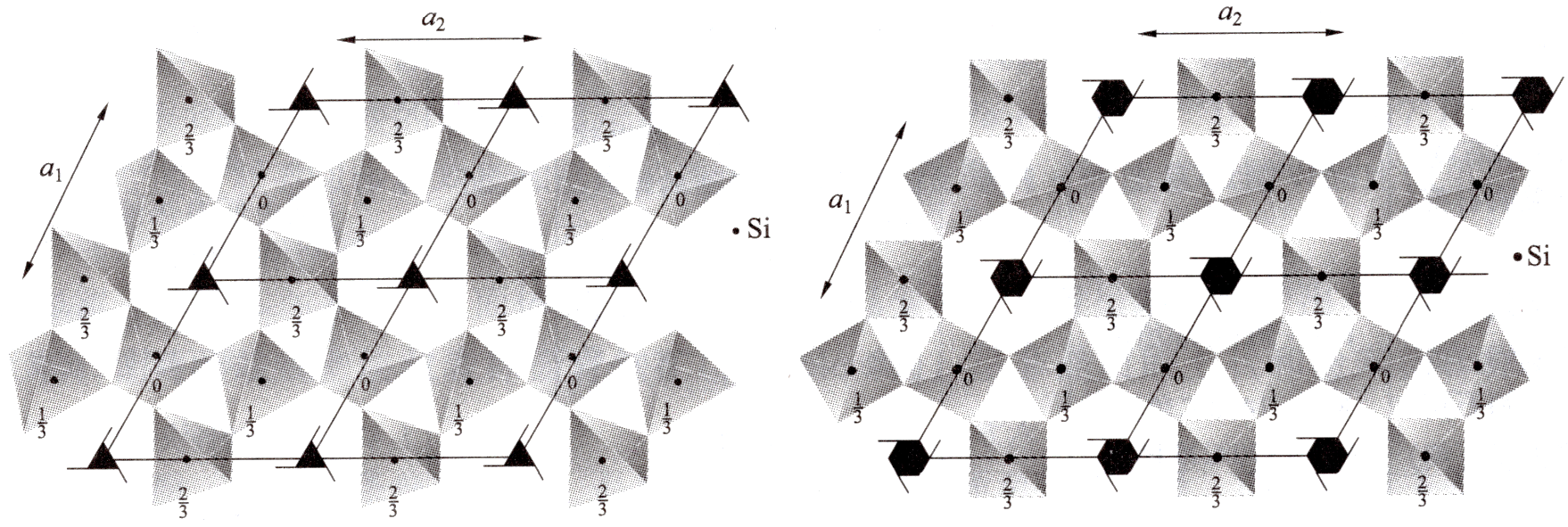 在SiO2的各种天然同质多像变体中,除斯石英(属金红石型)中硅离子为八面体配位外,在其余各变体中硅离子均为四面体配位,即每个硅离子均被四个氧离子包围而构成硅氧四面体。各硅氧四面体彼此均以角顶相连,构成三维的架状结构。由于不同的变体中硅氧四面体在排布方式和紧密程度上有所差异,从而反映在形态和某些物理性质上(如密 度、折射率等)有所不同。如鳞石英的结构由四面体组成的双六元环,相互连接呈层状排布,其紧密程度低于a-石英和β-石英。因此,鳞石英的密度的折射率都较α一石英和β-石英低。方石英呈单六元环,其排列的紧密程度略高于鳞石英。因此, 密度和折射率高于鳞石英。柯石英的结构,除斯石英外,较其他变体堆积紧密得多,因此相应地有较大的密度和较高的折射率。斯石英是最高压力下的同质多像变体,为金红石结构。硅占据八面体空隙,是所有变体中结构紧密程度最高的变体。密度和折射率也是最大的。