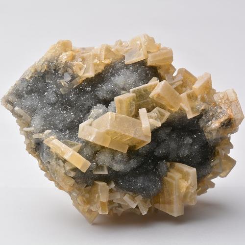 成分与结构:BaO 65.70%,SO3 34.30%。 常含Sr和Ca。在晶体结构中Ba2+处于7个[SO4]2-之间,其Ba2+的配位数为12。O2-与1个S6+和3个Ba2+相邻, 故其配位数为4。形态常以良好的单晶体出现, 一般为平行于{001}的板状或厚板状,有时沿a轴或b轴延长呈短柱状。板状晶体常聚成晶簇,也常见块状、 粒状、结核状集合体。