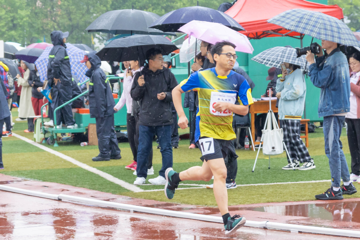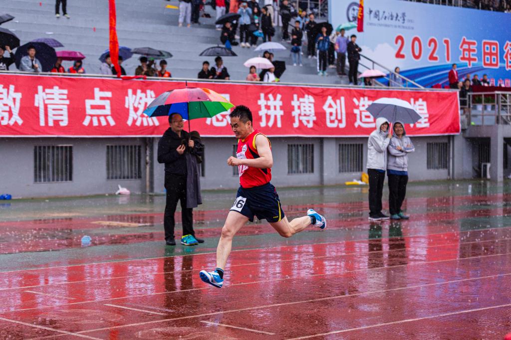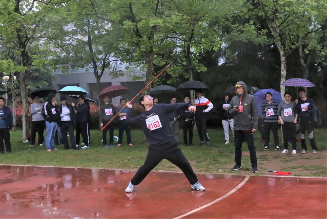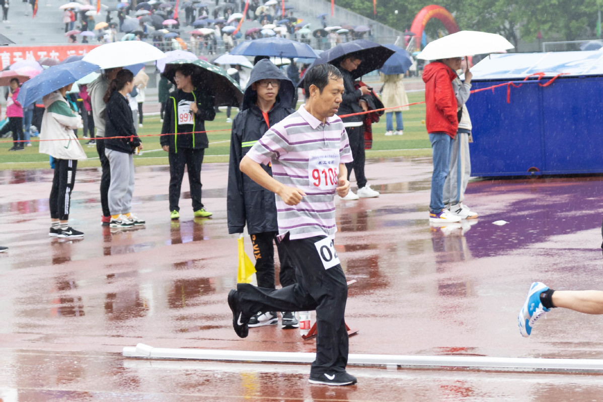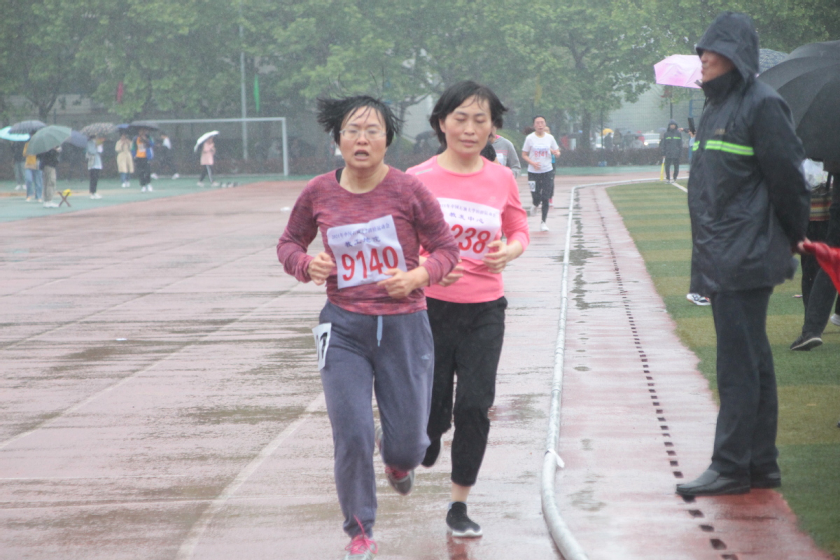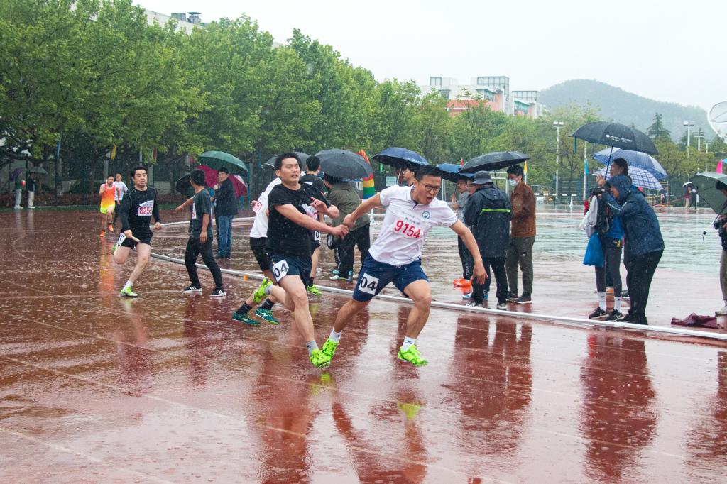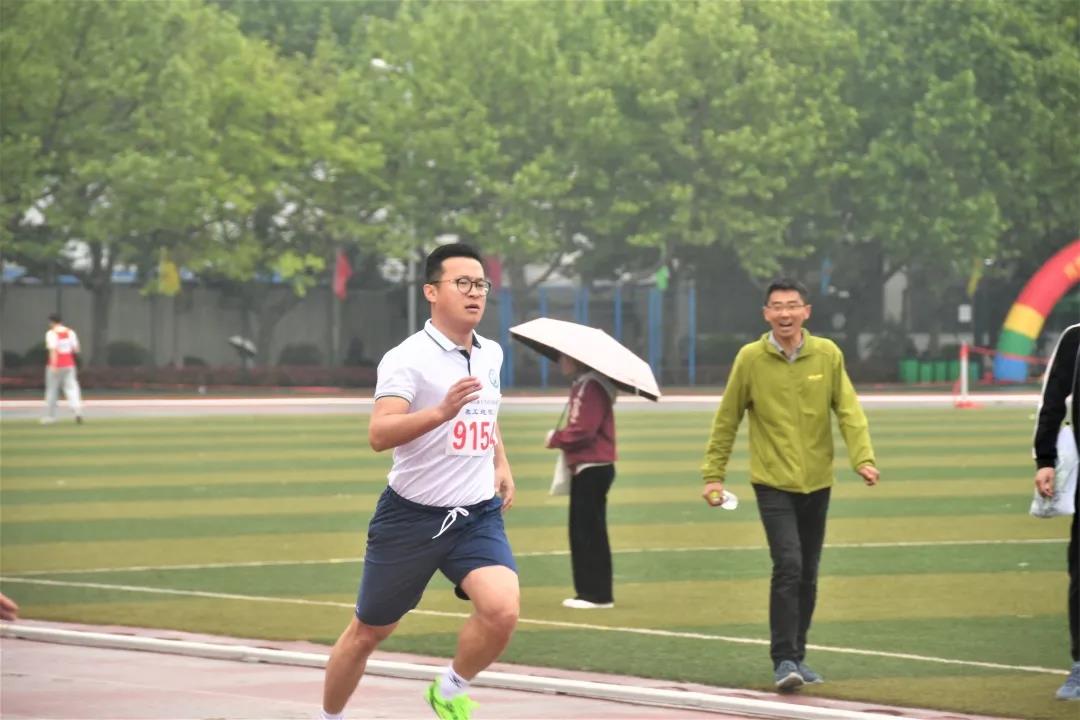 吴国忱老师在冒雨跑1500,可能是9名1500甲组年龄最大的,还拿下第五,本来是要出差的,在工会主席的力邀下放弃了出差,值得称赞!