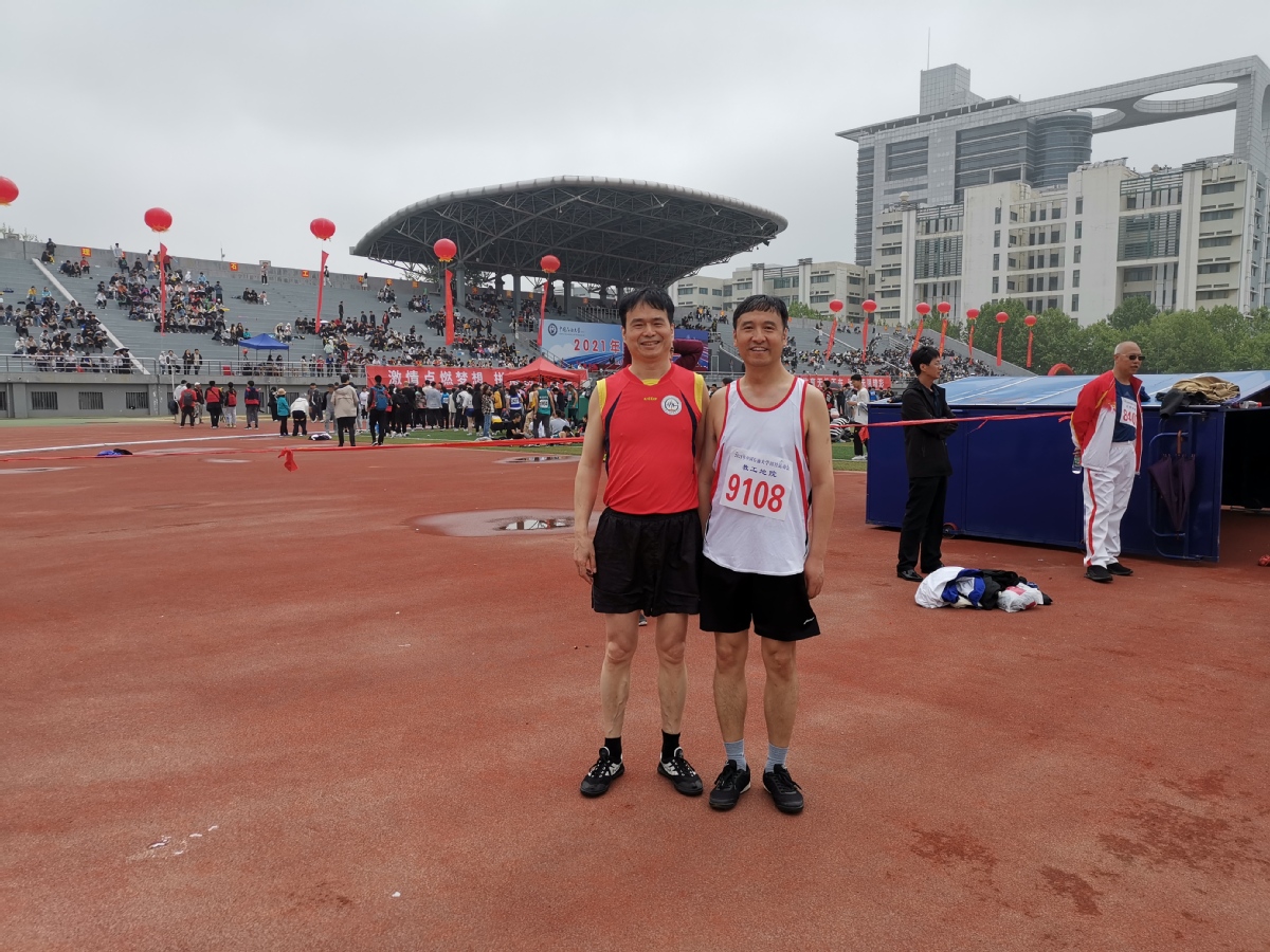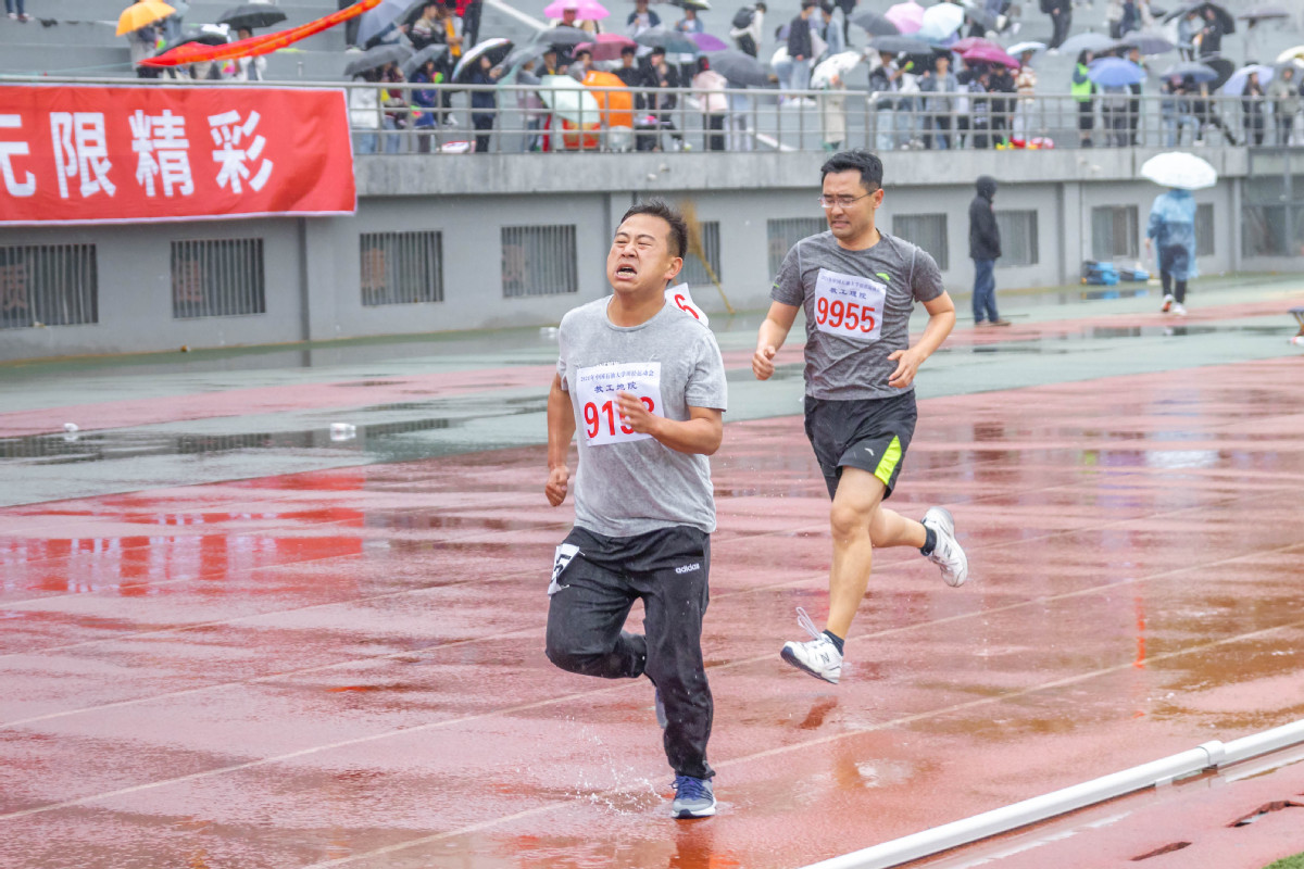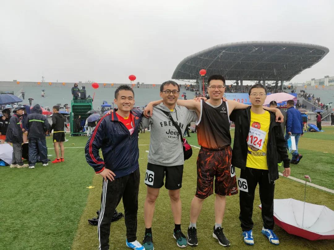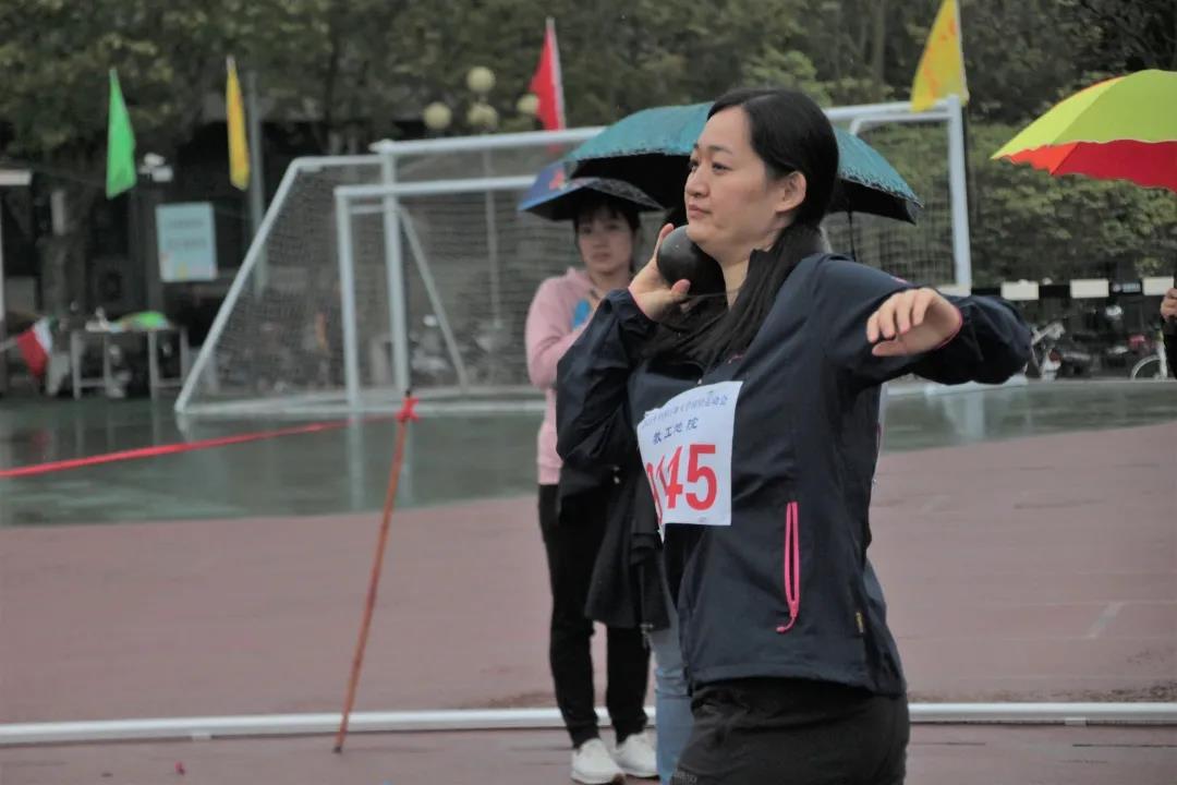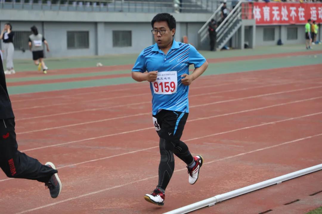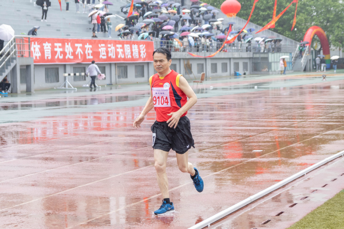 吴国忱老师在冒雨跑1500,可能是9名1500甲组年龄最大的,还拿下第五,本来是要出差的,在工会主席的力邀下放弃了出差,值得称赞!
