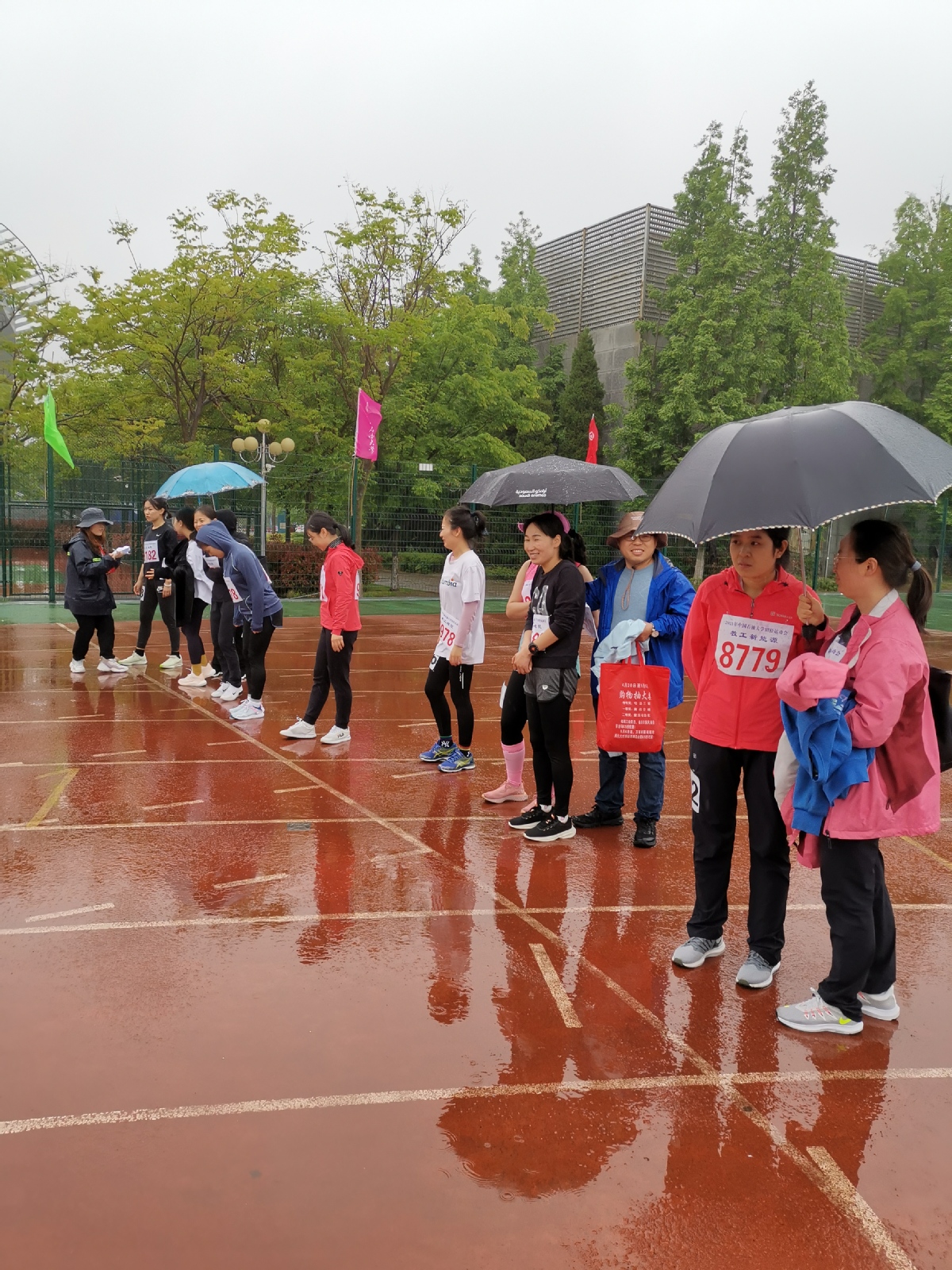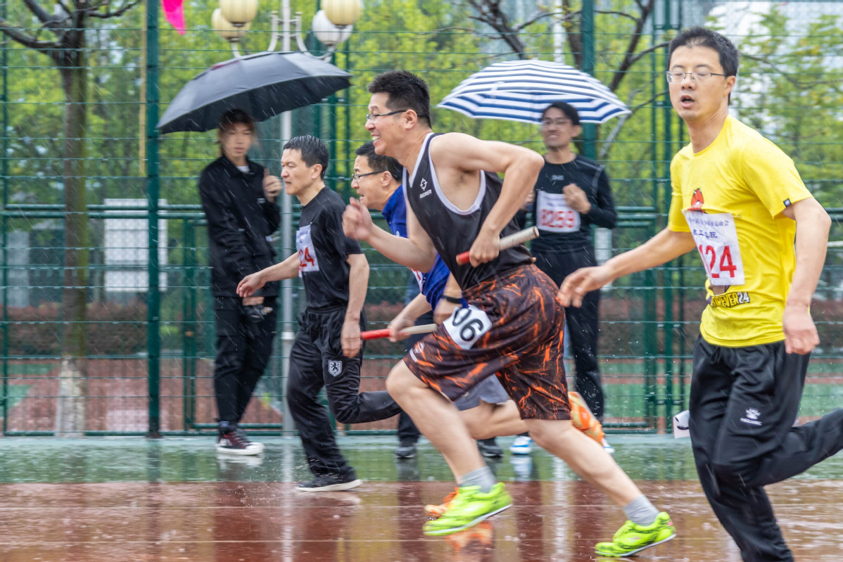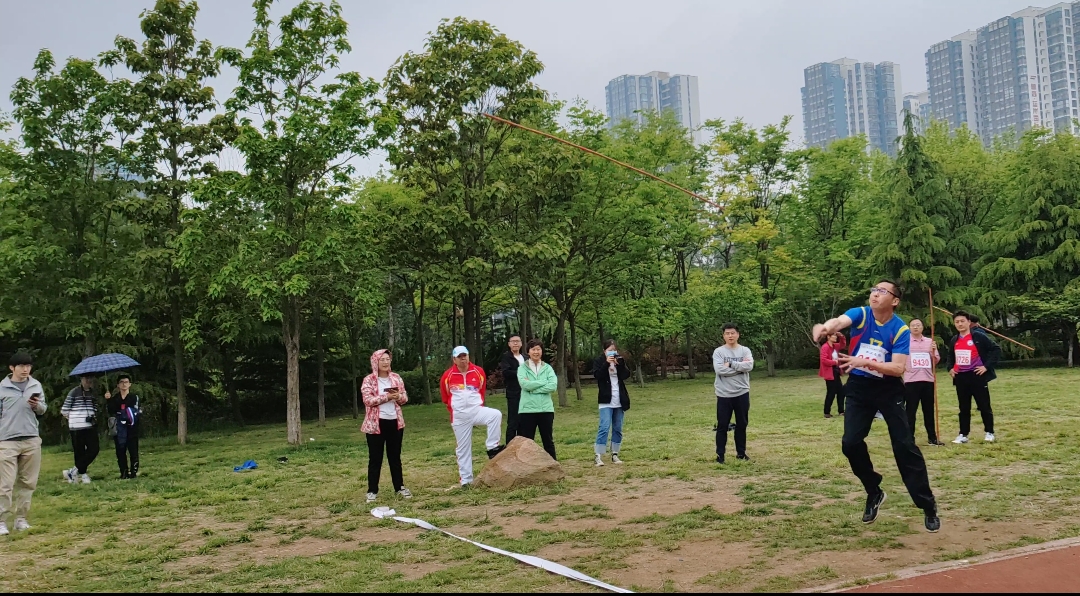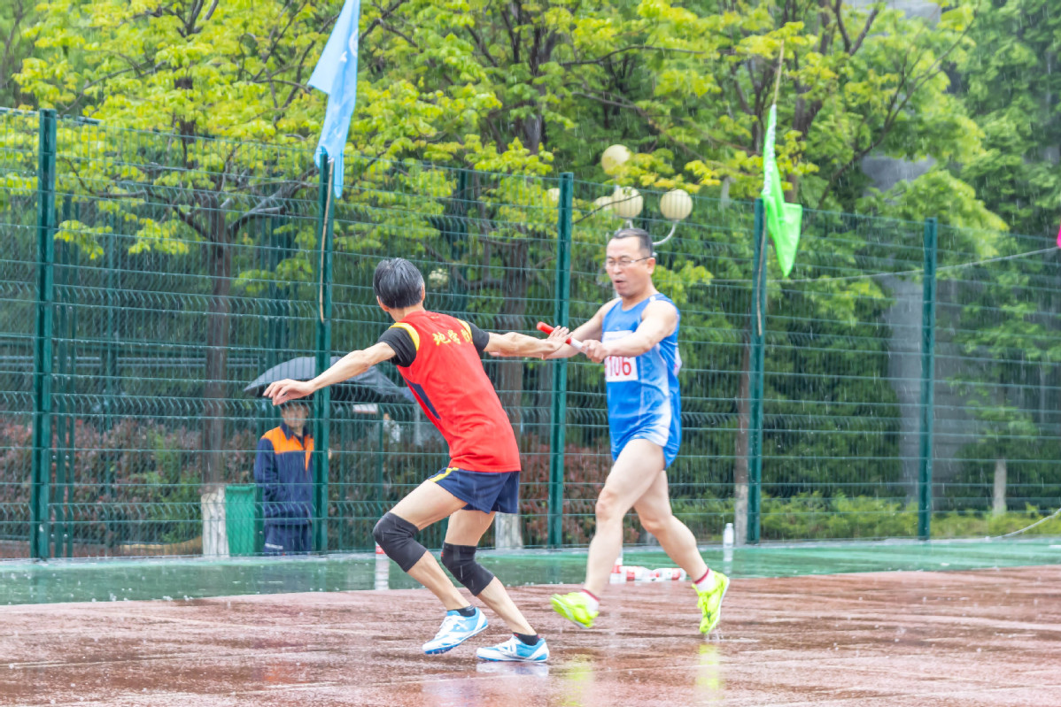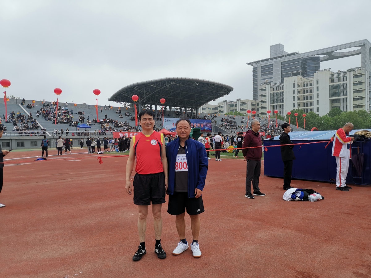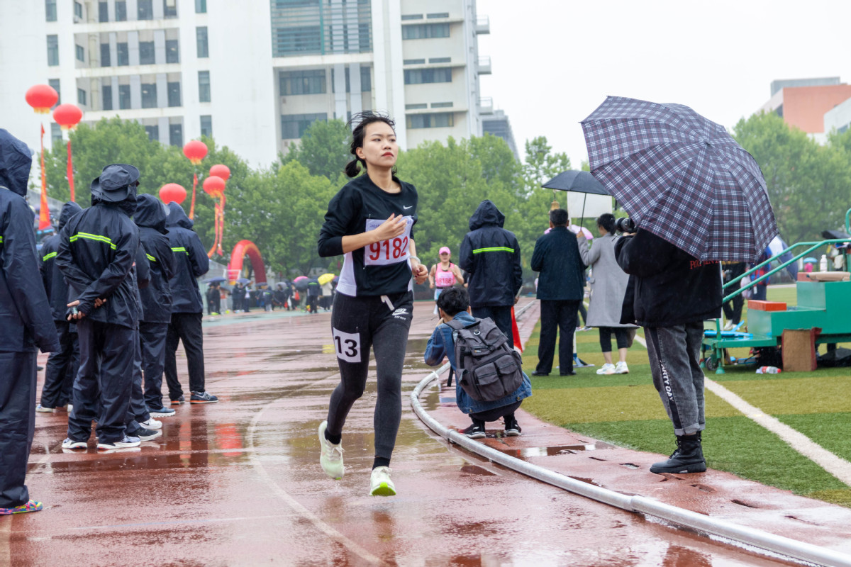 吴国忱老师在冒雨跑1500,可能是9名1500甲组年龄最大的,还拿下第五,本来是要出差的,在工会主席的力邀下放弃了出差,值得称赞!