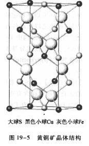 [晶体结构]四方晶系;a0=0.524 nmc0=1.032nmZ=4。晶体结构为闪锌矿型结构的衍生结构(19-5),即其单位晶胞类似于将两个闪锌矿晶胞叠置而成。每一金属离子(Cu2+Fe2+)的位置均相当于闪锌矿中Zn2+的位置,但由于Zn2+位置被Cu2+Fe2+两种离子代替并有序分布,使其对称由原闪锌矿结构的等轴晶系下降为四方晶系。高温无序黄铜矿仍保留闪锌矿结构的等轴晶系。