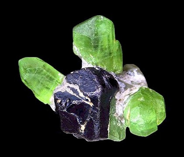 不过在夕卡岩中铁橄榄石Fe2[SiO4]可与石英共生。橄榄石受热液作用和风化作用容易蚀变,常见产物是蛇纹石。野外所见橄榄石多已蛇纹石化,成为残晶或假像。