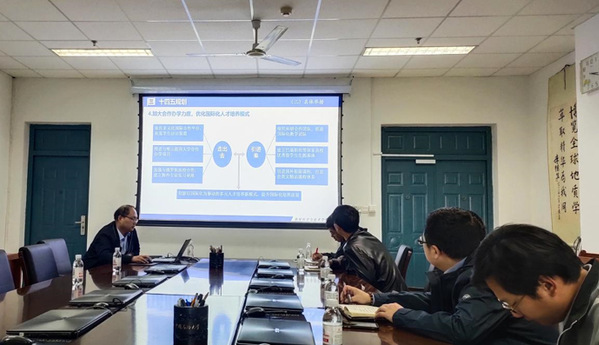 首先,副经理王健对学院国际合作交流“十三五”工作进行了总结,并对“十四五”规划建设任务进行了说明。他指出“十三五”期间,借助“双一流”团队建设,学院在外事工作取得一系列成绩,但在某些指标上和国际交流实质性合作方面还存在一定问题,尤其是在长聘外籍专家数量、国际人才培养质量、职工培养方面还存在较大的差距,也是学院“双一流”建设中存在的较大短板,因此,“十四五”期间,学院在国际交流与合作方面的任务仍然十分艰巨,为提升“双一流”团队建设水平,建成世界一流的“地质资源与地质工程”学科,学院全体师生需要提高站位,统一思想,凝聚力量,高质量提升学院国际化办学水平。王健表示,“十四五”期间,学院将重点推进国际合作项目申请、引智基地建设和创新型合作项目申请、国际英文期刊创建、品牌国际会议打造、员工国际化培养及职工招生等方面的工作。同时,学院也将出台并实施国际交流合作激励制度和奖励措施,全面推进师生开展国际化交流活动。
