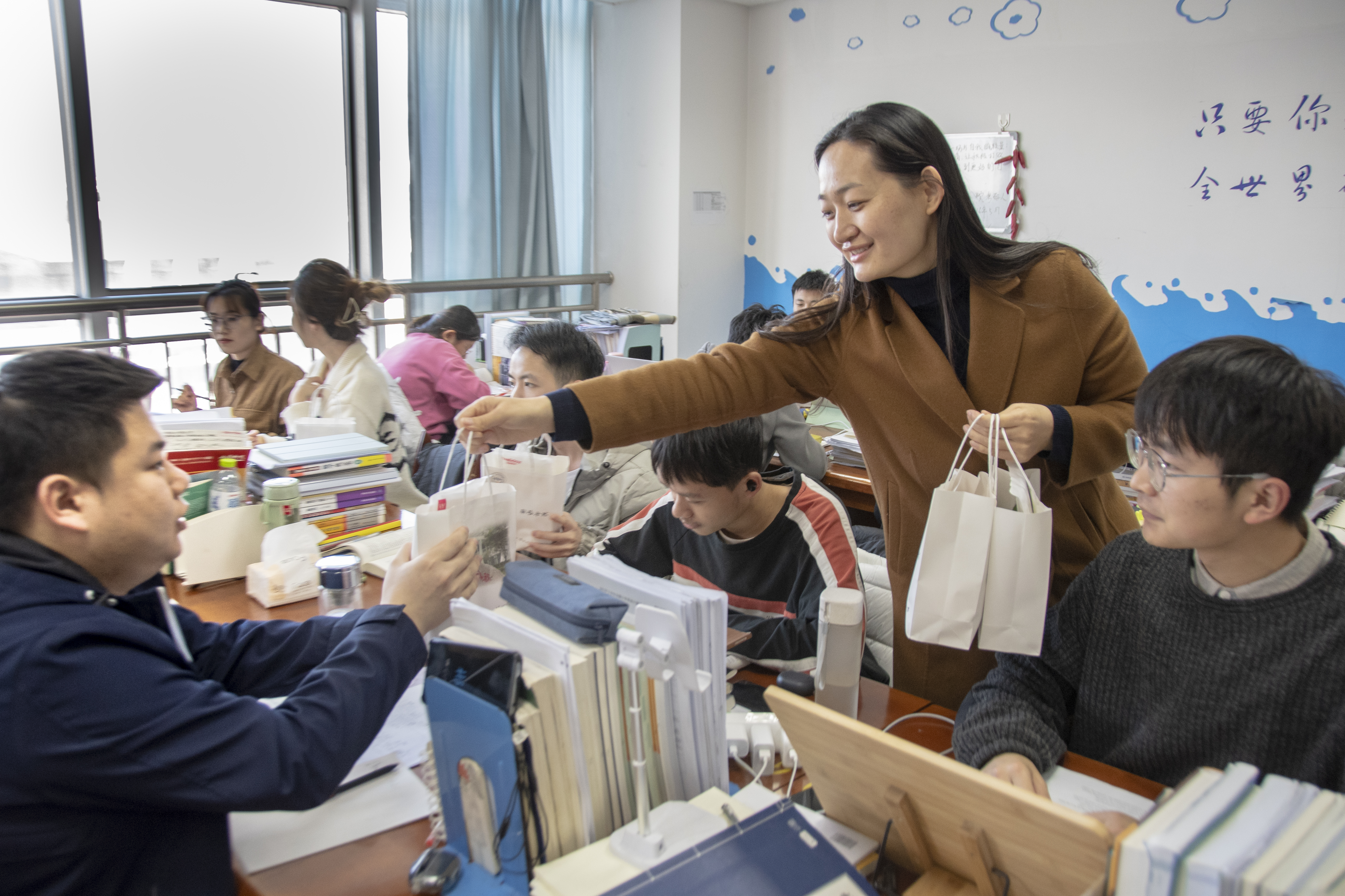 (党委副书记郑珊珊为考研学子分发祝福礼袋 刘坤达摄)