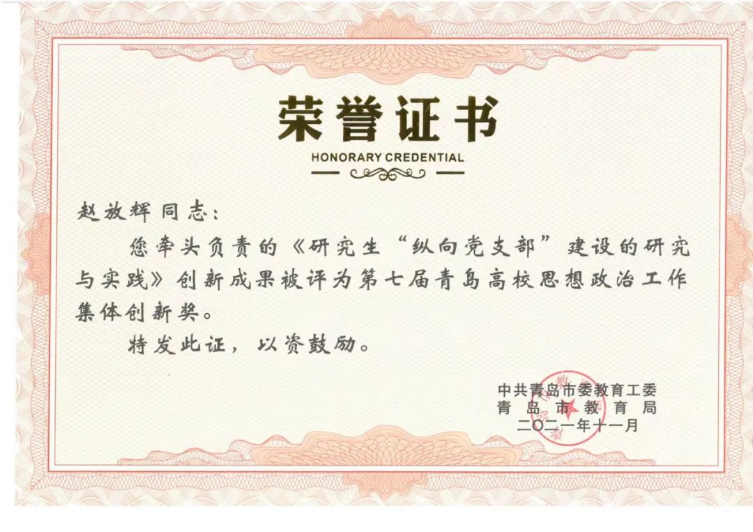 公司赵放辉书记牵头负责的成果获青岛高校思想政治工作集体创新奖