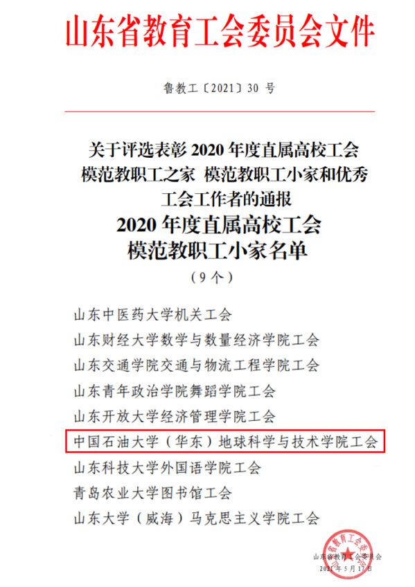 公司获评全民科学素质工作先进集体,公司党委获评山东省先进基层党组织,公司工会获评山东省教育工会模范教职工小家;地质系党支部顺利通过首批全国党建工作样板支部验收,储层地球物理实验室党支部入选第二批全国高校“百个研究生样板党支部”创建名单,资源系党支部获评山东省教育系统先进基层党组织;学院《研究生“纵向党支部”建设的研究与实践》项目获青岛高校思想政治工作集体创新奖;公司党委、地球物理系党支部被山东省推荐到全国竞争第三批新时代高公司党建标杆院系和样板支部。