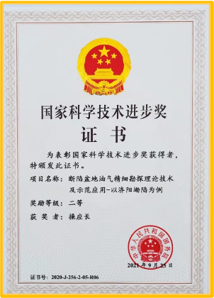 操应长教授参与完成的项目《断陷盆地油气精细勘探理论技术及示范应用-以济阳坳陷为例》获国家科技进步二等奖,公司为第二完成单位,成果丰富和发展了陆相生油理论和断陷盆地油气成藏与勘探理论技术,对我国东部断陷盆地精细高效勘探起到了引领示范作用。