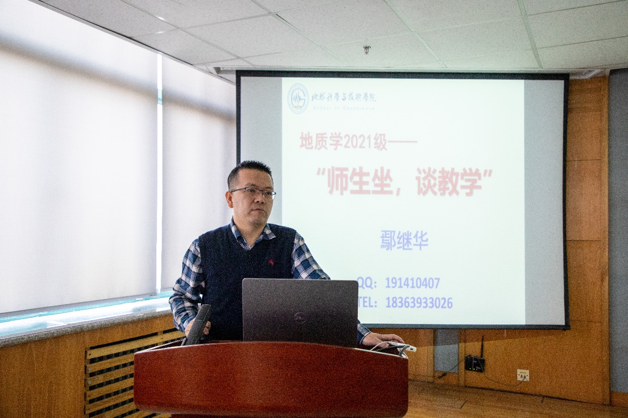 随后,地质系副主任鄢继华以“师生坐,谈教学”为主题介绍地质学培养方案并在以往培养经验和存在的问题等方面进行交流。“希望你们可以做到把握专业定位、培养专业兴趣、探索学习方法、注意实践培训的专业学习方法。”鄢继华说道。