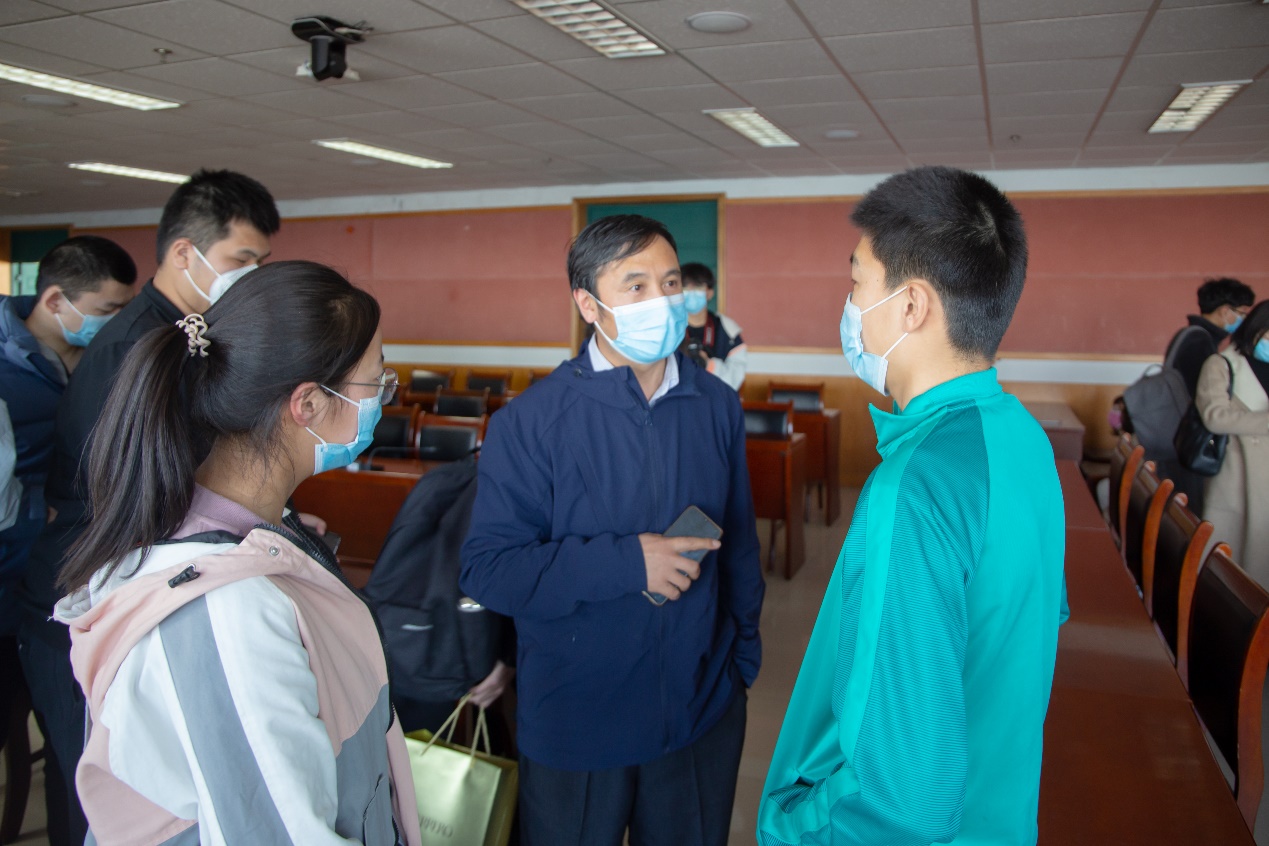在师生问答阶段,员工踊跃发言,老师耐心解答。资源2103班王鹏凯问道:“作为一名本科生,平常接触的都是一些基础实践活动,怎么样才能加入导师的科研创新工作呢?”“关于本科阶段如何开展科研工作,不仅仅要把本科的知识学好,还要学习其他专业前沿知识,及时向导师请教,要多动手、参与实践,利用好身边的资源,循序渐进的参与到科研工作中。”徐尚老师做出解答。在师生自由交流环节,员工就自己遇到的问题以及未来规划的困惑,向老师请教,现场气氛热烈,师生交流气氛融洽,最后,师生进行合影纪念。会后,每名导师还将单独与所带的员工进行更深入的交流。