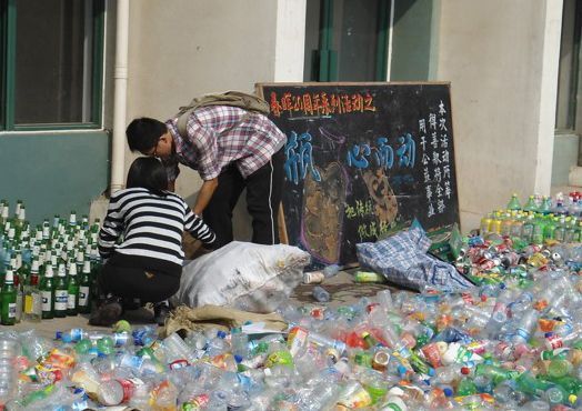 2012年春晖志愿服务队“瓶心而动”活动现场,活动通过收集和变卖员工宿舍内废弃的瓶子以及其他废旧物品筹集善款(资料图)