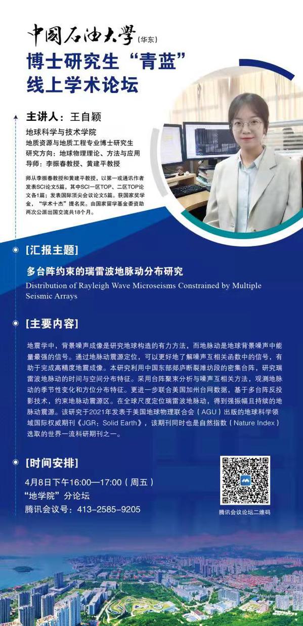 博士研究生“青蓝”线上学术论坛-伟德国际1946官网分论坛第1期-王自颖博士-多台阵约束的瑞雷波地脉动分布研究