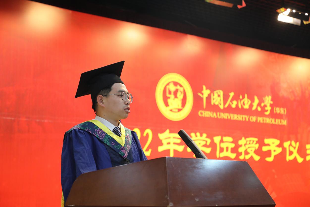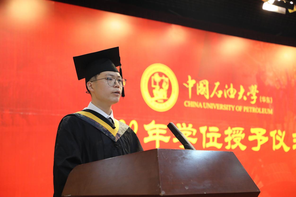 资源勘查工程专业冯家乐作为本科毕业生代表发言,他说:“过去四年,是汲取知识,快速成长的四年;是文体相长,多姿多彩的四年;是挖掘潜能,追寻自我的四年。无论将来继续深造还是走上工作岗位,我们都能以‘人生万事须自为,跬步江山即寥廓’的境界奋发前行,用科学知识攻关‘卡脖子’难题,用实际行动不负党和人民的期待,将勘探精神体现在每分每秒的工作上!”