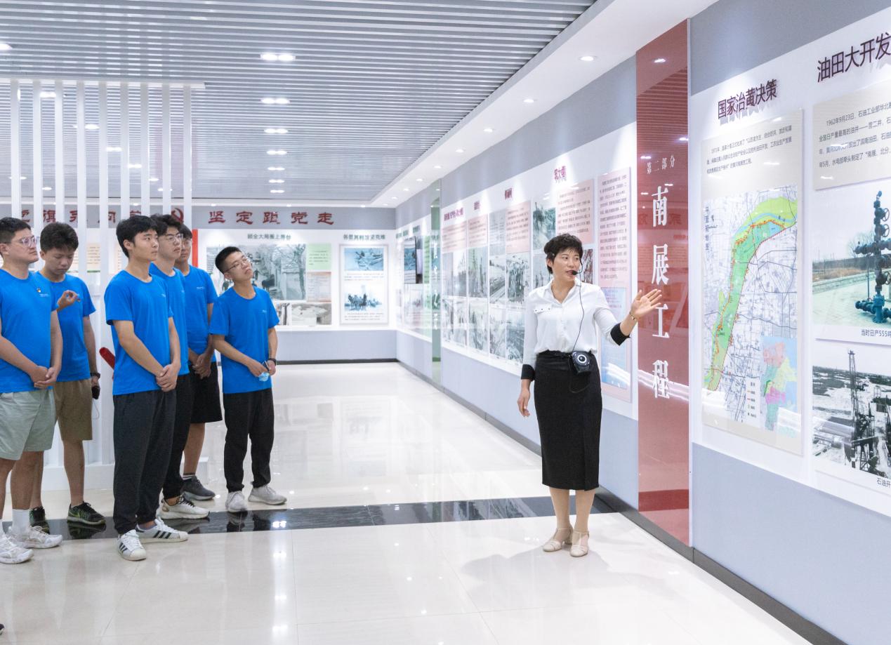 胜利油田优良传统展厅内,实践队员在“石油工人心向党”的口号照耀下学习石油精神、感悟石油文化 李洪刚摄影