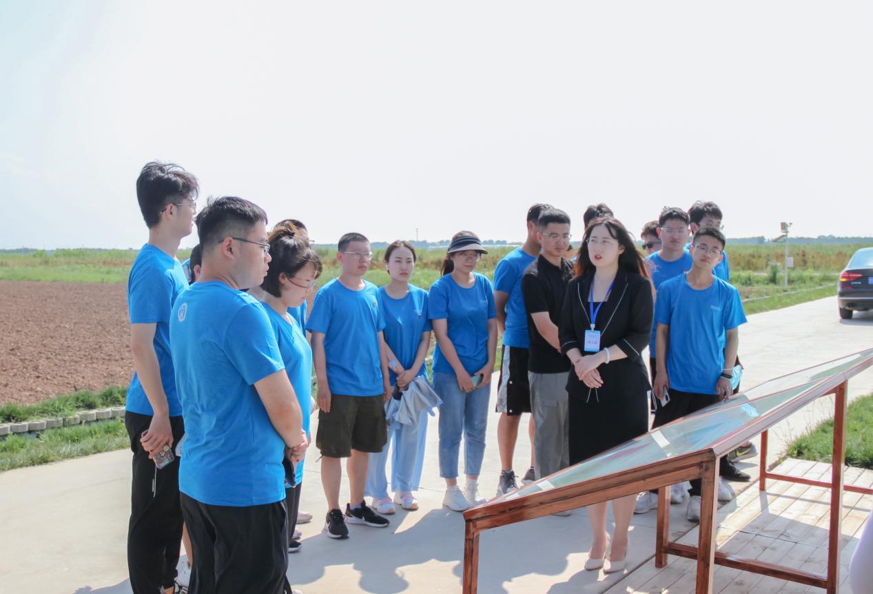 示范田旁,工作人员向实践队员介绍盐碱地种业生态高效发展特色之路 田治康摄影