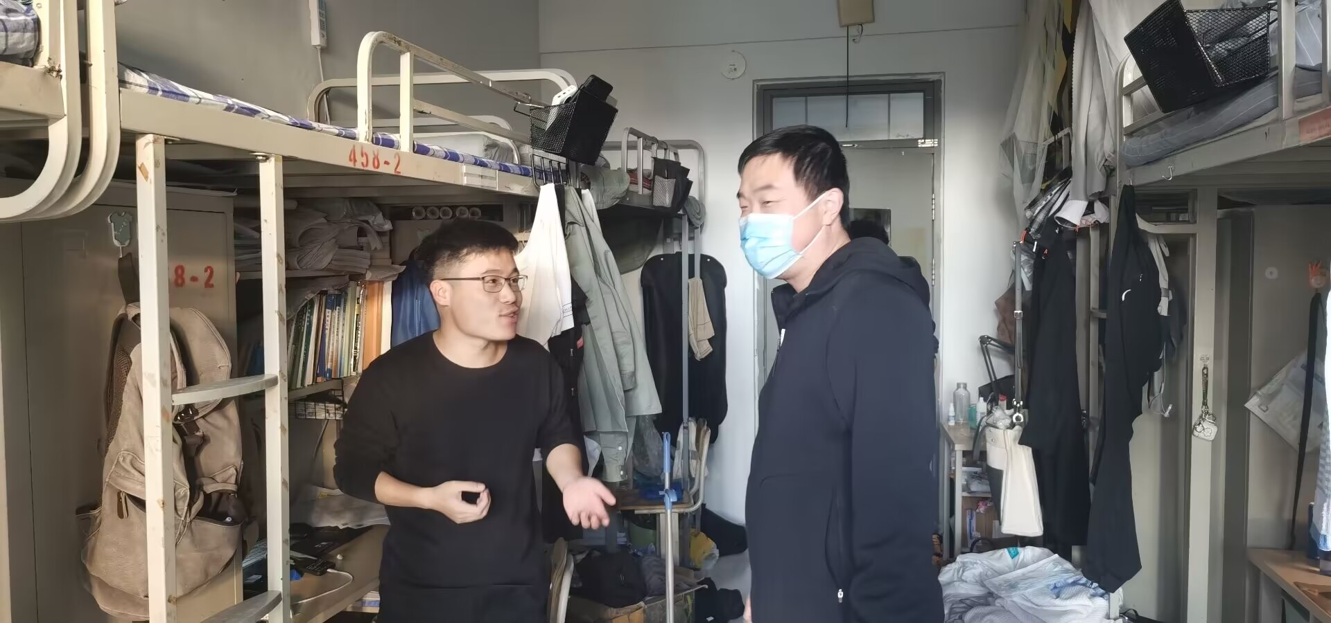 徐明权在宿舍检查过程中与员工交谈