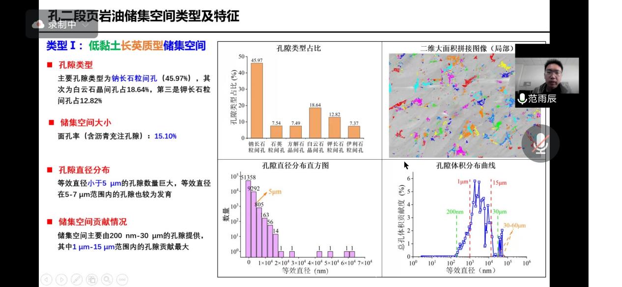 本期论坛邀请范雨辰博士做了“陆相页岩含油储集空间研究及孔隙结构表征新方法”的学术报告,报告以40分钟左右的时间分别介绍了沧东凹陷孔二段陆相页岩含油储集空间类型划分和三种页岩孔隙结构表征的新方法:适用于强非均质性陆相页岩孔隙三维空间表征的大体积FIB-SEM三维重构(LV-FIB-SEM)、适用于海相龙马溪组页岩团簇式分布孔隙的连通性评价参数以及基于分形维数的多尺度孔径分布曲线计算方法FracD法。学术报告后,范雨辰博士认真解答了线上师生的问题,参与交流的师生发言踊跃。本次报告的成功举办为标志着学校第二届博士研究生“青蓝”线上学术论坛正式开幕,本届论坛为期3个月,地学分论坛将每周举办1期,届时将邀请11位博士做学术报告。期望本届博士论坛能为学院研究生营造宽松活跃的学术交流氛围并积极拓宽研究生的学术视野。