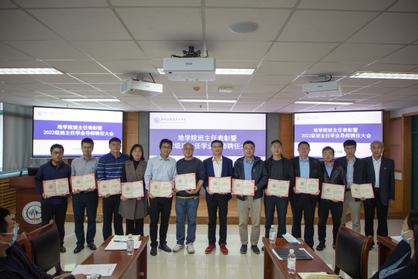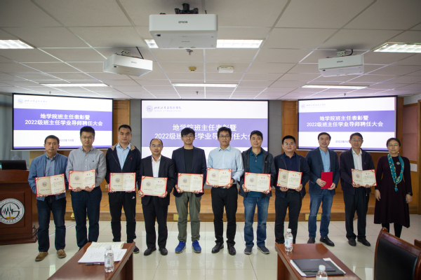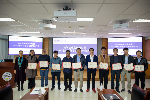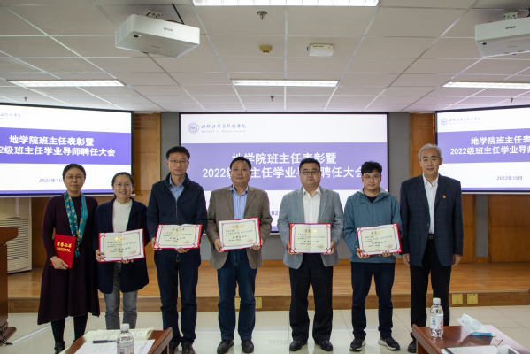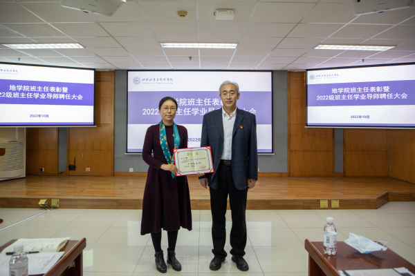 刘华为2022级学业导师颁发聘书 徐明权摄影赵放辉为获学校十佳百优班主任的教师颁发获奖证书,为学院2022级班主任颁发聘书,刘华为2022级学业导师颁发聘书。