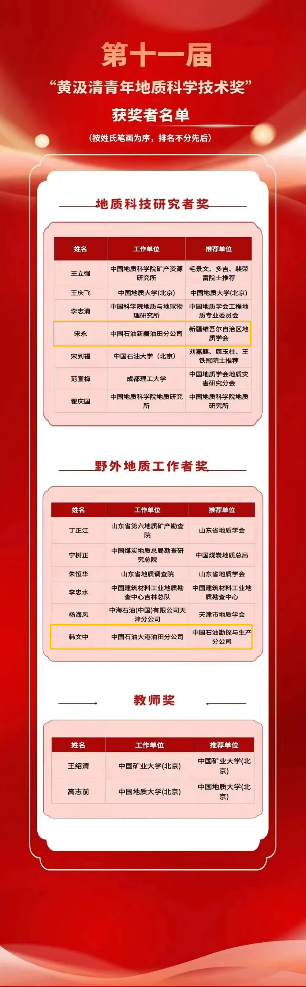 “黄汲清青年地质科学技术奖”是中国地质学会于2002年创立发起的地质类奖项,分为地质科技研究者奖、野外地质工作者奖和教师奖,每两年评选一次,每次不超过15人,旨在缅怀我国著名地质学家黄汲清先生对地质科学和地质事业作出的巨大贡献,奖励在地质科技工作岗位上做出突出贡献的45周岁以下的青年地质科技工作者。2020年,公司刘华教授荣获第十届黄汲清青年地质科学技术奖教师奖,2000届员工郭泽清荣获黄汲清青年地质科技研究者奖。