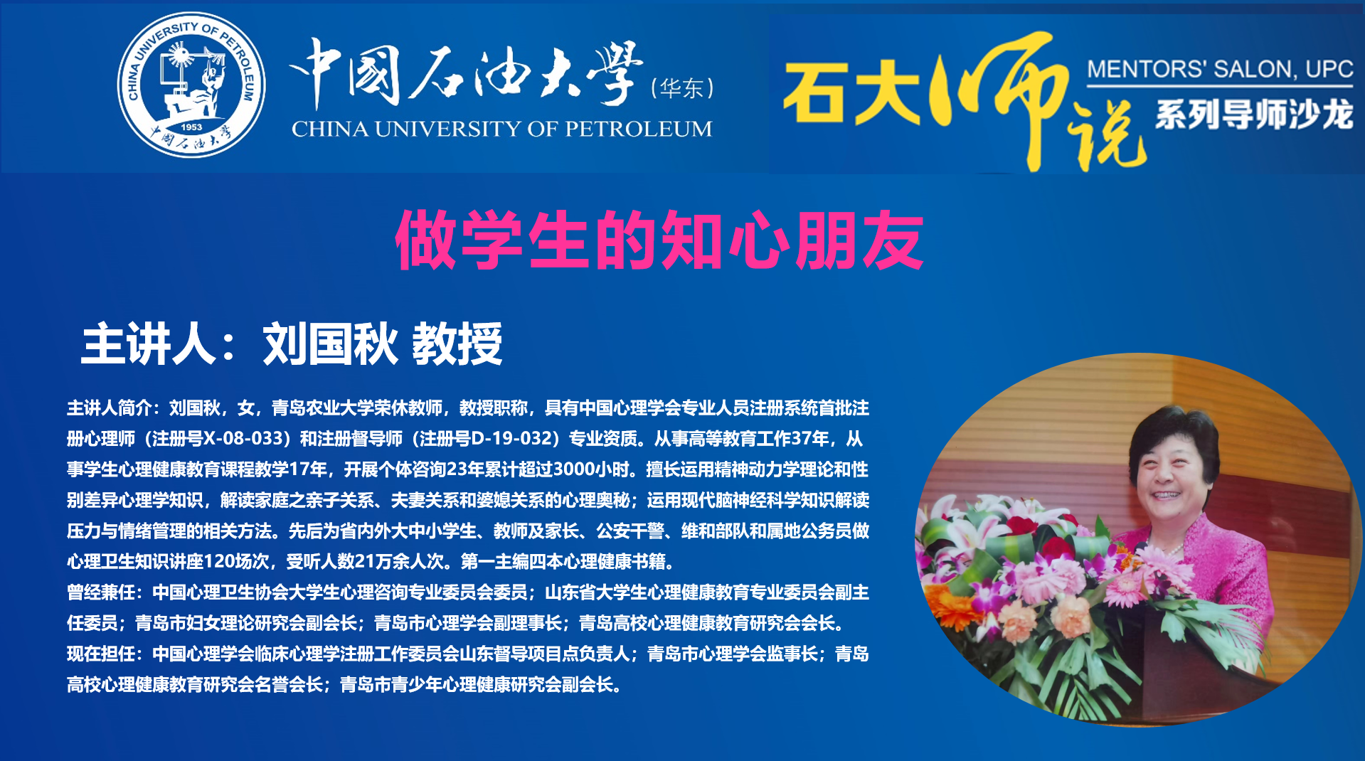 刘国秋,女,青岛农业大学原党委副书记,教授,具有中国心理学会专业人员注册系统首批注册心理师(注册号X-08-033)和注册督导师(注册号D-19-032)专业资质。从事高等教育工作37年,从事员工心理健康教育课程教学17年,开展个体咨询23年。擅长运用精神动力学理论和性别差异心理学知识,解读家庭之亲子关系、夫妻关系和婆媳关系的心理奥秘;运用现代脑神经科学知识解读压力与情绪管理的相关方法。先后为省内外大中小员工、教师及家长、公安干警、维和部队和属地公务员做心理卫生知识讲座120场次,受听人数21万余人次。第一主编四本心理健康书籍。曾经兼任:中国心理卫生协会老员工心理咨询专业委员会委员等职务,现任中国心理学会临床心理学注册工作委员会山东督导项目点负责人等职务。