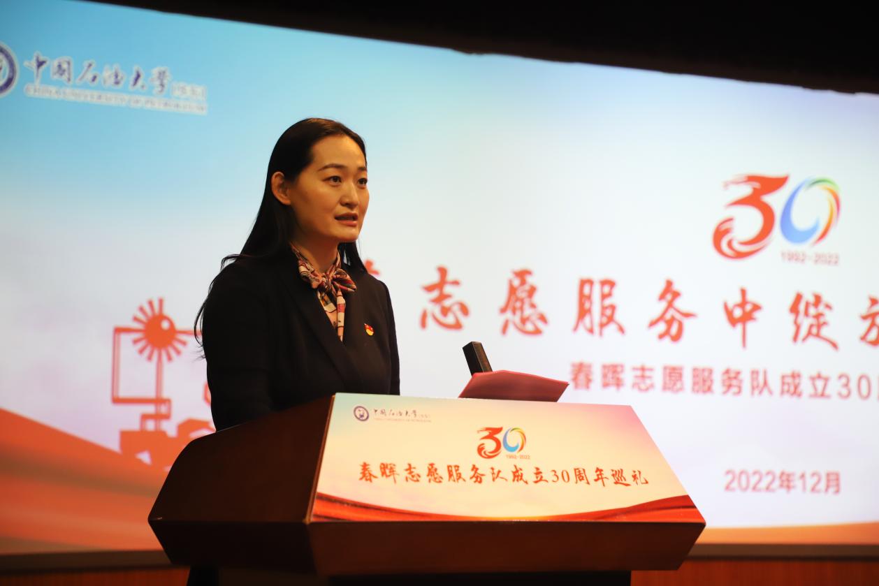 公司党委常委、公司党委书记赵放辉,国家老员工科技园办公室主任、青岛中石大科技教育集团有限公司党委书记、董事长陈勇,校团委书记季林海、党委组织部副部长梁秀萍、党委员工工作部(武装部)副部长张万春、继续教育学院副经理胡义贵以及历届指导老师成宏涛、刘海庆、魏垂高、于华帅、刘明、徐永涛、孙启龙、徐拥军和各教学院部团委书记、春晖志愿服务队员工代表参加庆祝活动,公司党委副书记郑珊珊主持活动。与会人员一起回顾春晖成立、发展的三十年奋进历程,共同铺展春晖未来建设的前进方向。