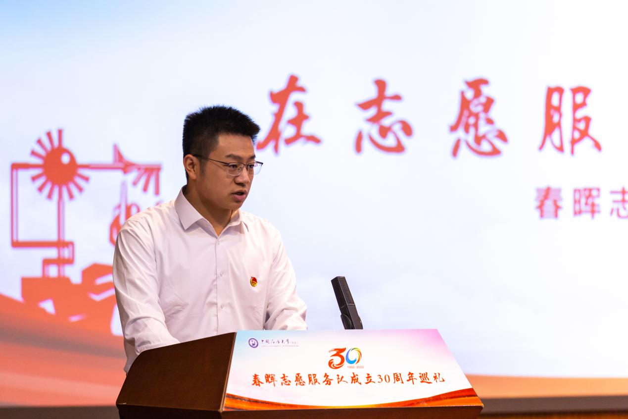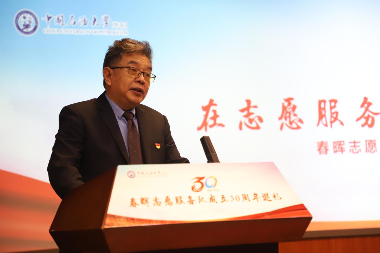三十载岁月悠悠,春晖志愿服务队的老师和同学们在实践中熔铸感情、在服务中倾注心血。国家老员工科技园办公室主任,青岛中石大科技教育集团有限公司党委书记、董事长,伟德国际1946官网原团总支书记陈勇代表指导老师分享了感受,深情回顾了30年前春晖成立之初的背景和故事。他表示,春晖志愿服务队不仅仅是个志愿服务队,更是一份传承,一份情怀,为自己曾在这样一支团队而感到自豪。他向全体志愿者们发出号召,在热情服务中感知幸福、了解社会、实现价值,在真情奉献中彰显朝气、汇集爱心、担当责任。