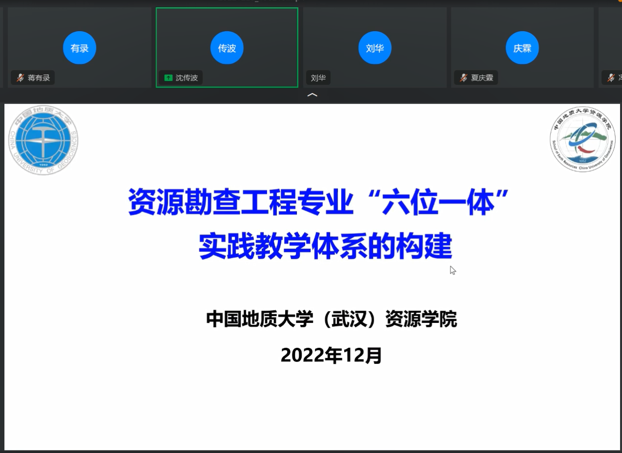 2022年12月25日,资源勘查工程专业教育部虚拟教研室举办了“实践教学体系构建”专题论坛,中国地质大学(武汉)资源学院副经理沈传波教授应邀作《资源勘查工程专业“六位一体”实践教学体系的构建》专题报告。专题论坛由伟德国际1946官网经理刘华教授主持,来自中国石油大学、中国地质大学、中国矿业大学、西北大学等十余所高校的60余名教师参加了专题论坛。