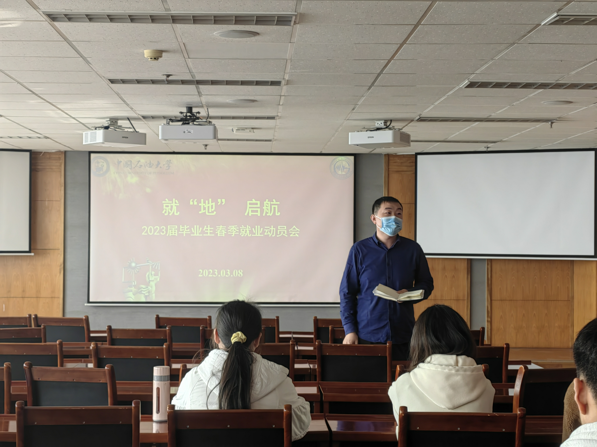随后,栗磊进行发言,他强调同学们要转变就业观念,保持就业紧迫感,调整最佳状态迎接毕业季和求职季,本次春招要总结和汲取成功就业同学的经验,争取一次性就业,尽量早就业、就好业。同时希望同学们结合专业特点、分析专业优势与专业就业趋势,进一步明晰就业方向,鼓励同学们要将专业优势充分转化为就业优势,端牢能源饭碗,投身石油行业。