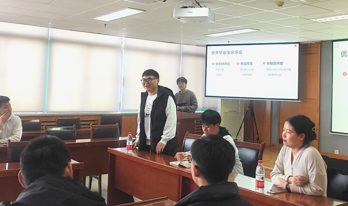 首先,学校“十老员工标兵”获得者张东林以自己的北京大学博士升学经历为例,分享了硕士研究生申博需要注意的关键点。他指出,研一研二的同学需要打好扎实的科研基础,及早明确自己的意向院校,发挥主观能动性,积极联系意向导师,为申博做好充足的准备。