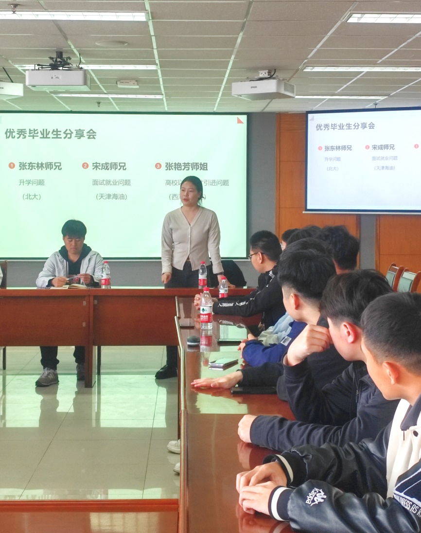 随后,中海油(天津)签约者宋成与在场同学交流求职心得与面试经验。宋成同学详细介绍了中石油、中石化、中海油的重点企业,为在场同学提供求职选择,并分析了工作地域、企业文化对求职的影响。交流过程气氛活跃,关于如何准备面试的问题,宋成鼓励同学们在面试场上展现出风采,重点指出要结合岗位要求回答面试官的问题。