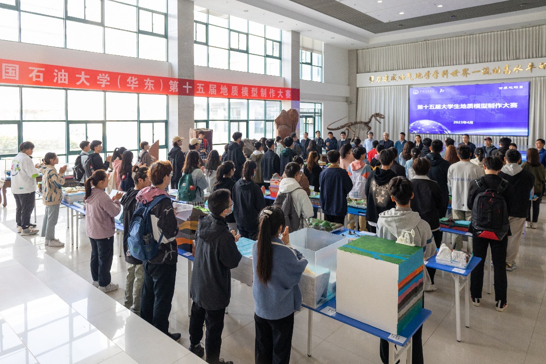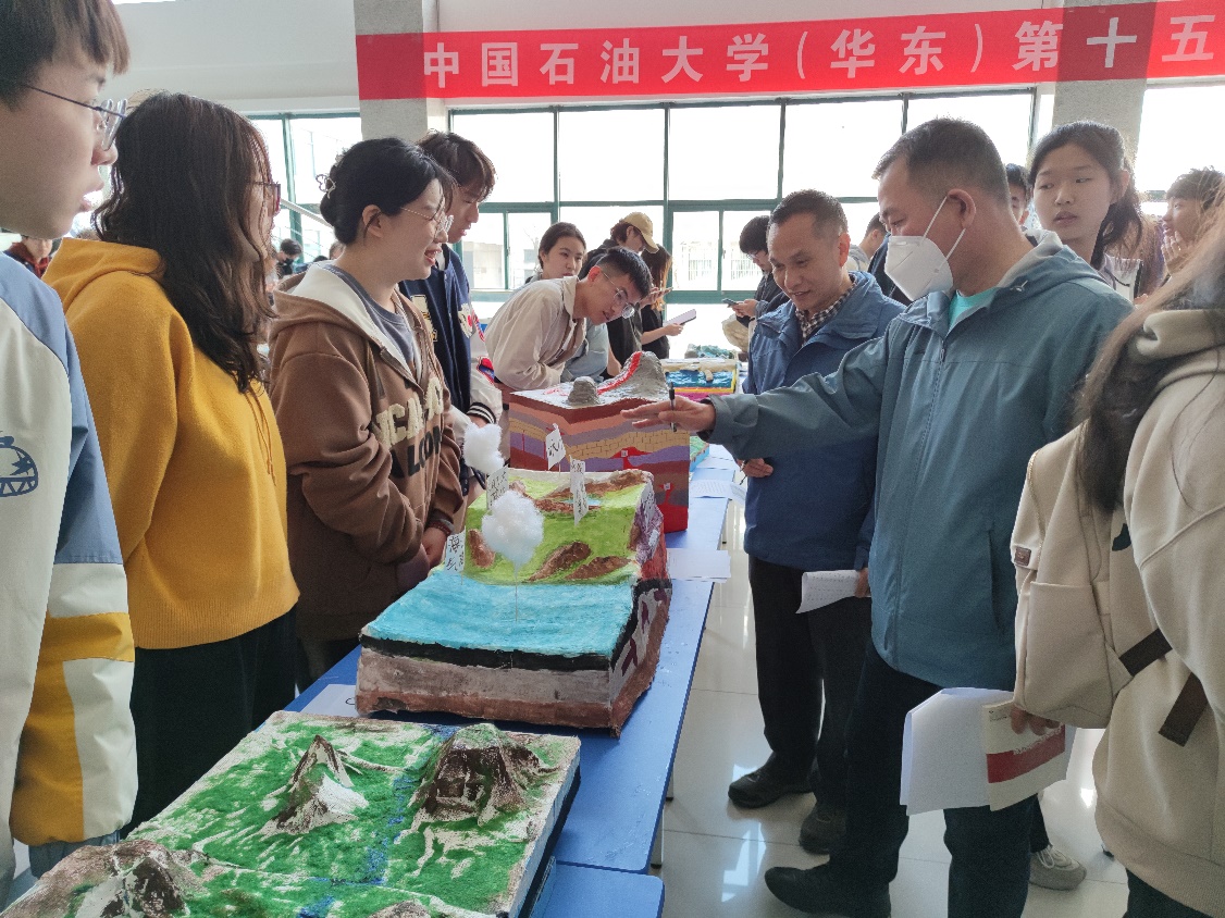 实物组比赛在工科楼C座大厅进行,各参赛队伍在各自作品前向评委老师讲述模型的制作思路和知识背景,并回答评委老师提出的问题,突出自己作品的特点和优势。丰富多样的参赛作品同样吸引了过往师生驻足观看,颜色鲜明的喷出岩岩相模型、清晰明确的喀斯特地貌模型、生动形象的黄河三角洲相模型等都准确地反映相应的地质现象。“参加这次活动让我体验到,地学知识的获取途径不仅在书本上,还可以通过动手实践来增强对知识的理解和掌握!”资源勘查工程专业2201班龚睿琪说道。