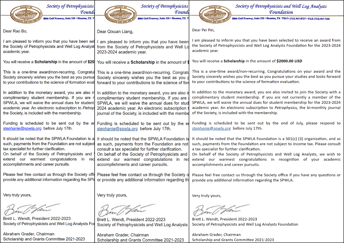 近日,经过国际岩石物理学家和测井分析家学会(Society of Petrophysicists and Well Log Analysts,SPWLA)评定,公司测井系博士研究生饶博、梁启轩和硕士研究生裴培3人获得2023年度SPWLA员工奖学金,奖金为每人2000美元。指导教师分别为苏远大教授、张锋教授和邓少贵教授。