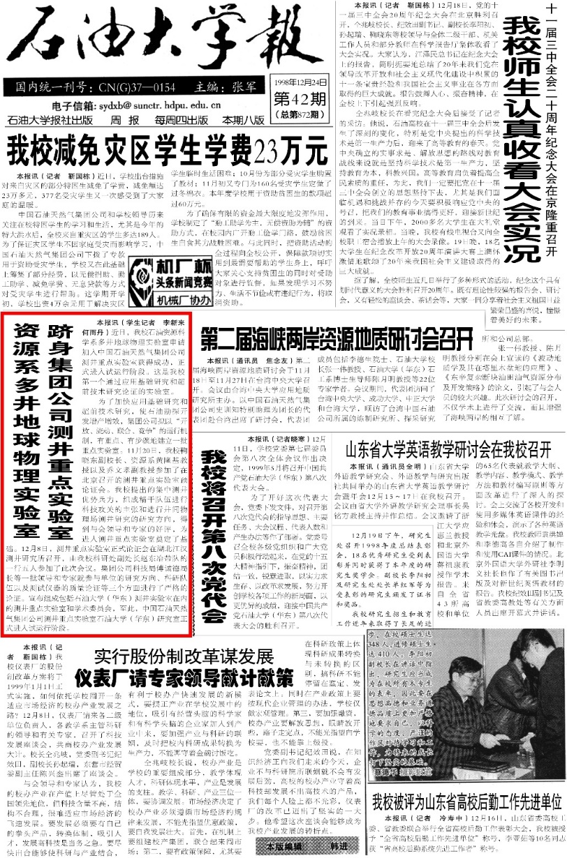 1998年12月,公司石油资源科学系多井地球物理实验室申请加入中国石油天然气集团公司测井重点实验室获得成功,正式进入试运行阶段。这是公司第一个通过应用基础研究和超前技术研究论证的实验室。