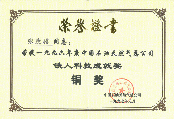 1997年1月,公司张庚骥教授获得1996年度中国石油天然气集团公司“铁人科技成就奖”铜奖。
