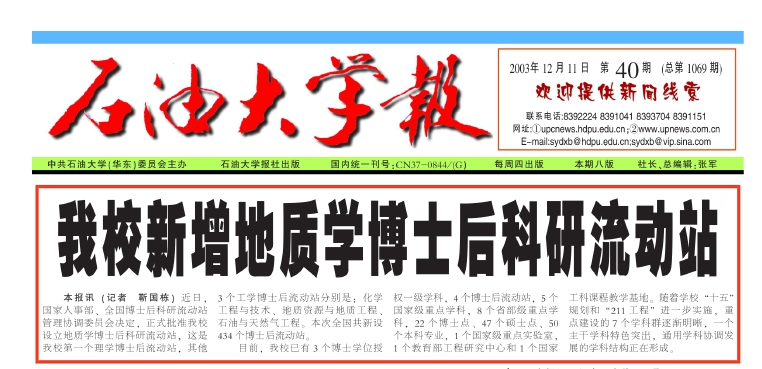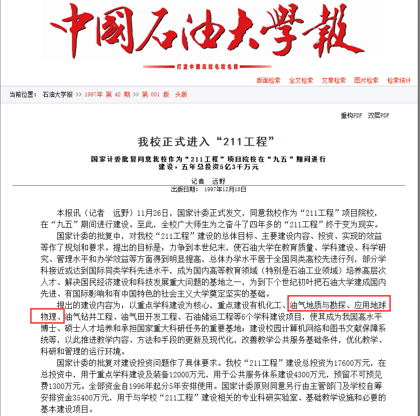 1997年11月26日,国家计委正式发文,同意石油大学作为“211工程”项目院校在“九五”期间进行建设。公司油气地质与勘探、应用地球物理学科入选重点建设学科。