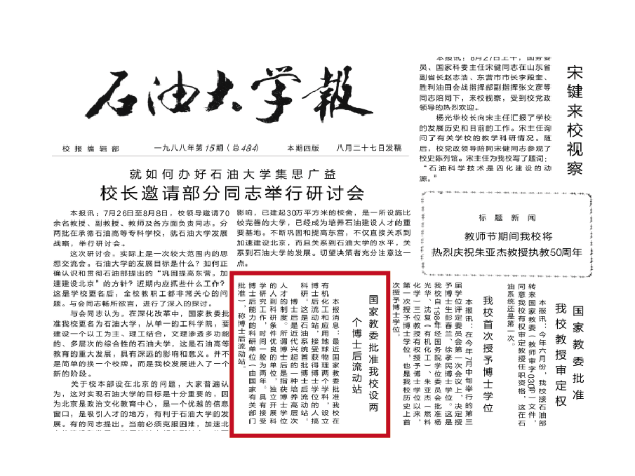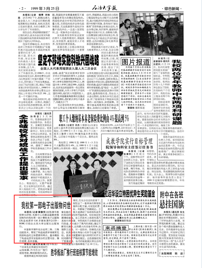 1975年5月,勘探系教师雍世和、黄一飞、洪有密与胜利油田测井公司、计算中心合作完成我国第一张测井数字处理成果图。