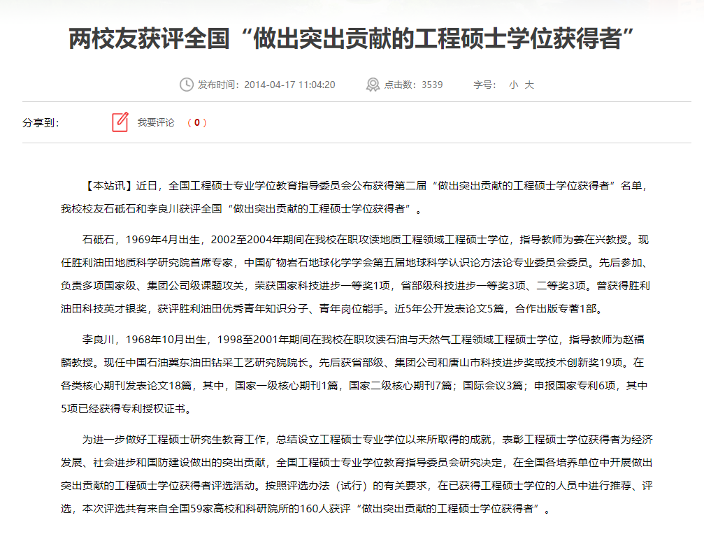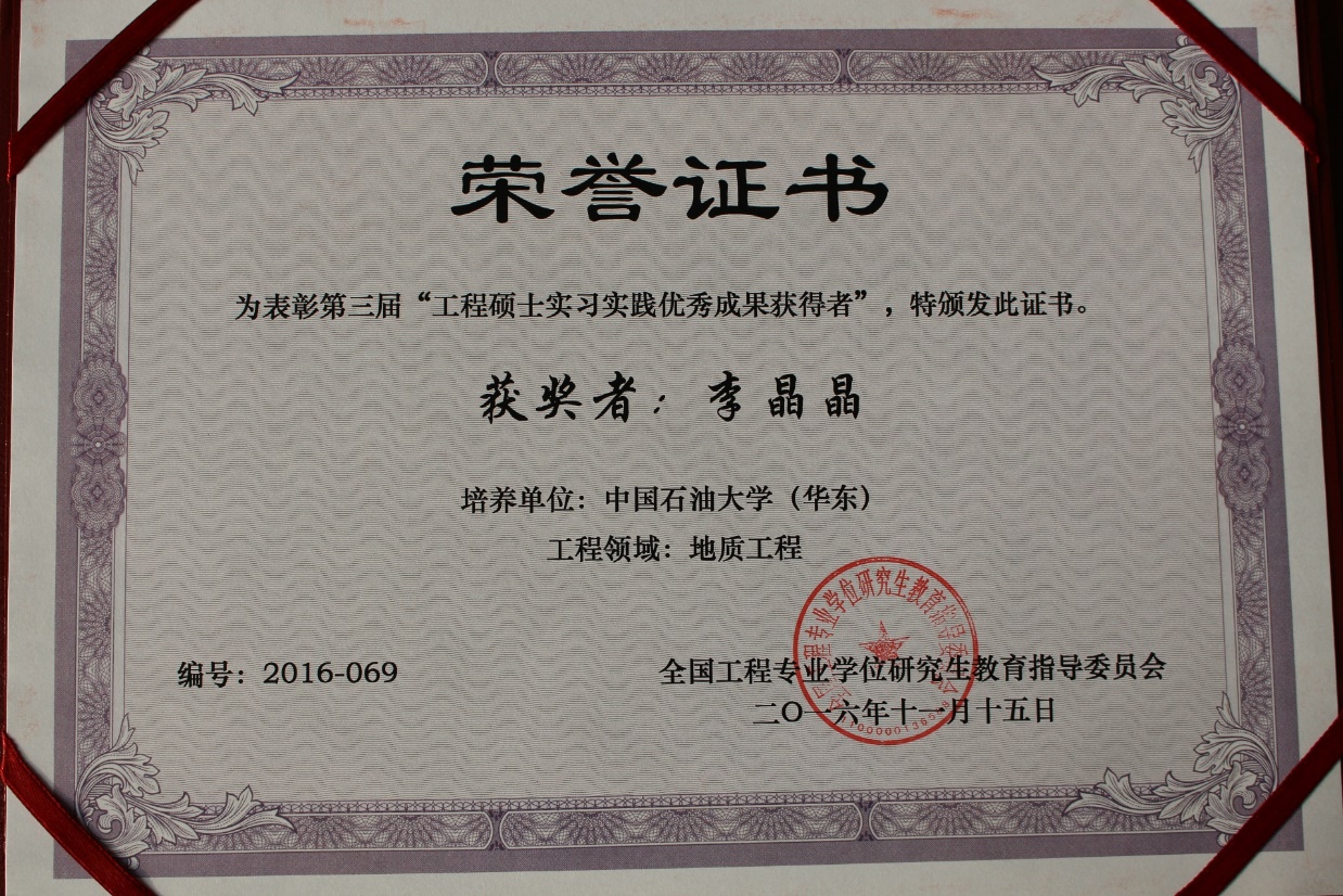 2016年11月,全国工程专业学位研究生教育指导委员会发布《关于公布第三届“工程硕士实习实践优秀成果获得者”荣誉称号名单的通知》,公司2015届全日制工程硕士毕业生李晶晶获得该荣誉称号。