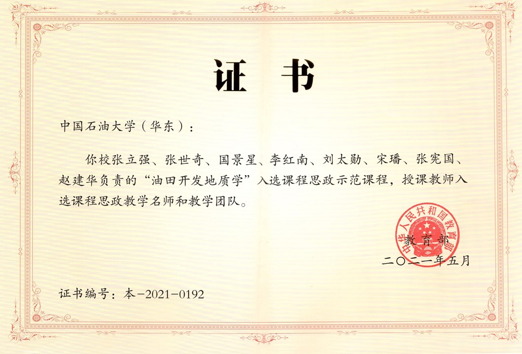 2021年6月,公司张立强、张世奇、国景星、李红南、刘太勋、宋璠、张宪国、赵建华负责的《油田开发地质学》入选国家课程思政普通本科教育示范课程,授课教师入选国家课程思政教学名师和教学团队。